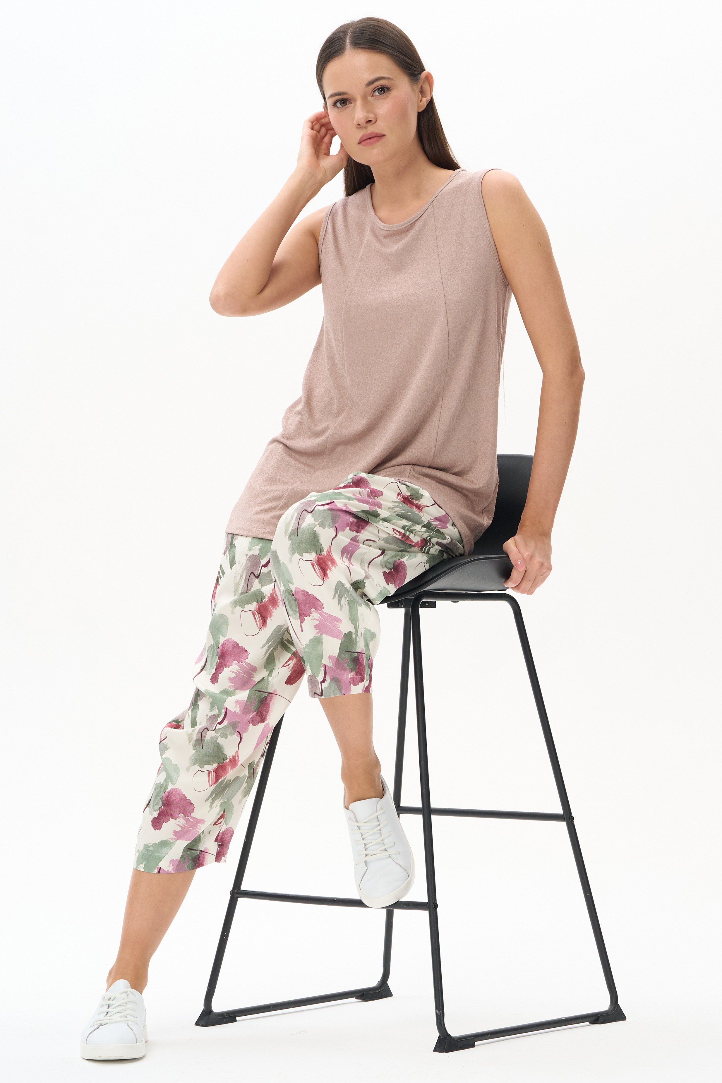 Топ из вискозного жаккардового трикотажного полотна. Круглый вырез горловины, без рукавов. Рост модели 175 см.