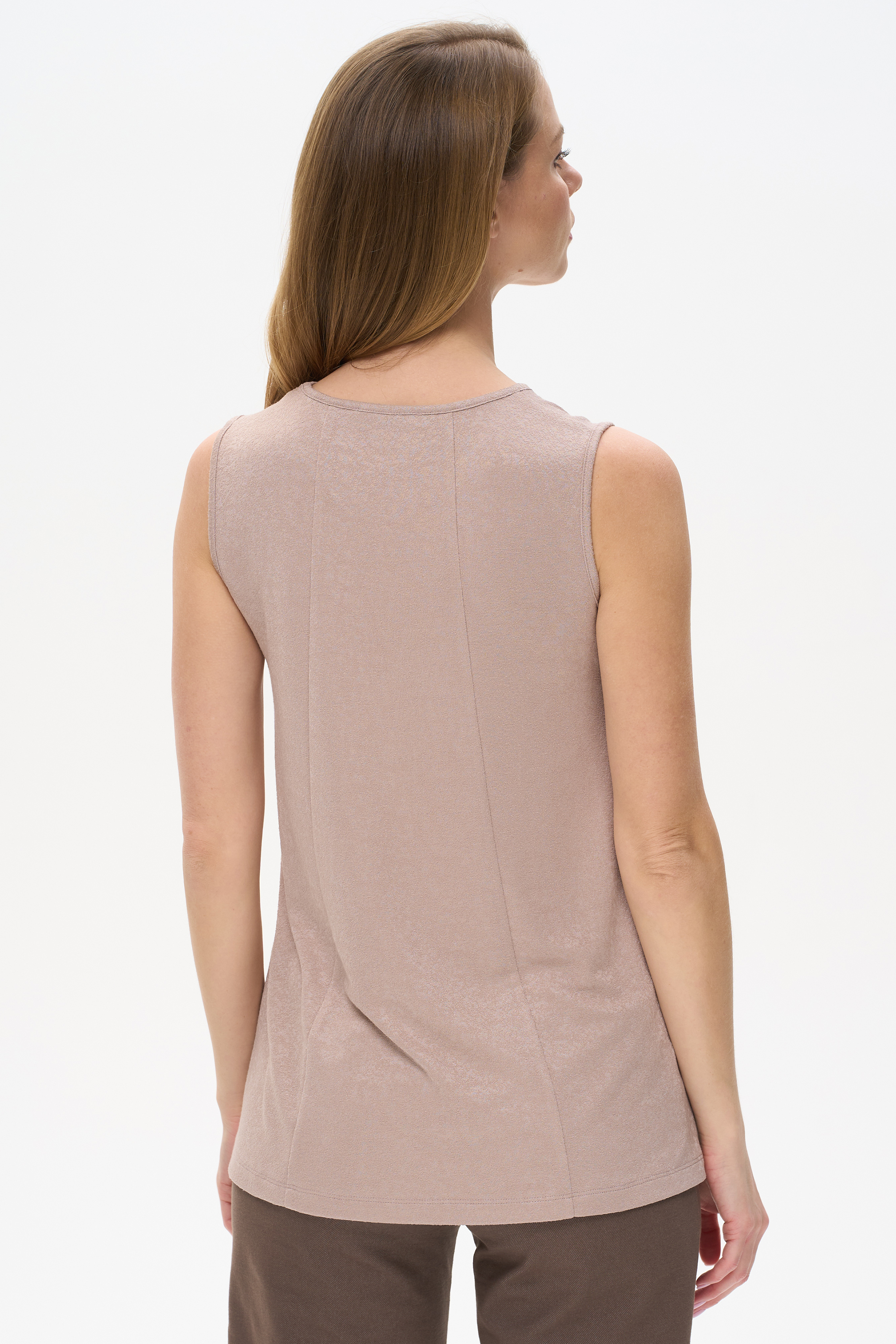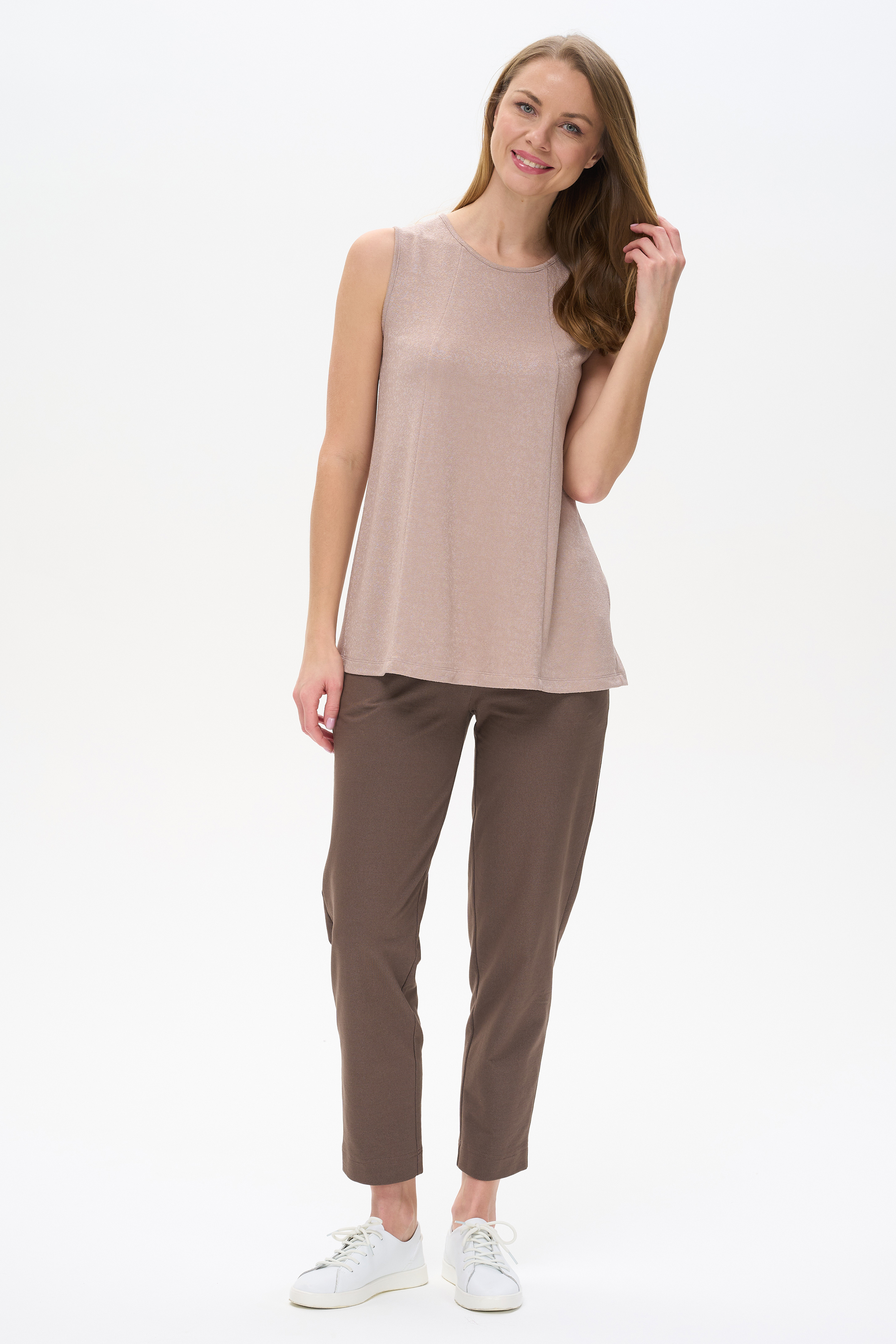 80% вискоза, 15% полиэстер, 5% эластан Элегантный удлинённый топ из вискозного жаккарда 230 гр с красивой фактурой и благородным блеском в оттенке Капучино. Модель с круглым вырезом горловины, без рукавов, расширенный крой создаёт эффектный силуэт. Легко сочетается со многими изделиями коллекции. Рост модели 175 см.