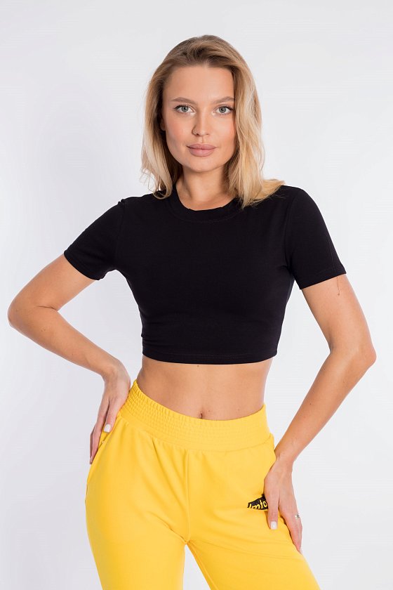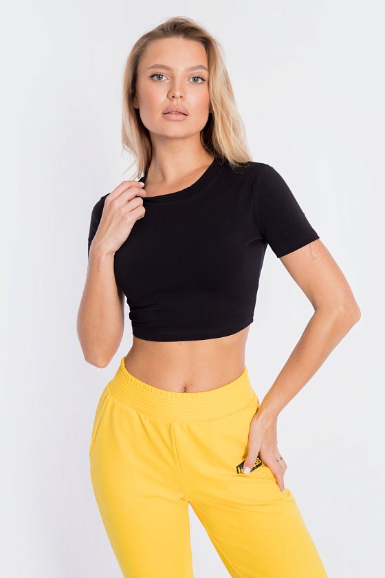 Топ из однотонной кулирки с лайкрой. С коротким рукавом. Длина выше талии.