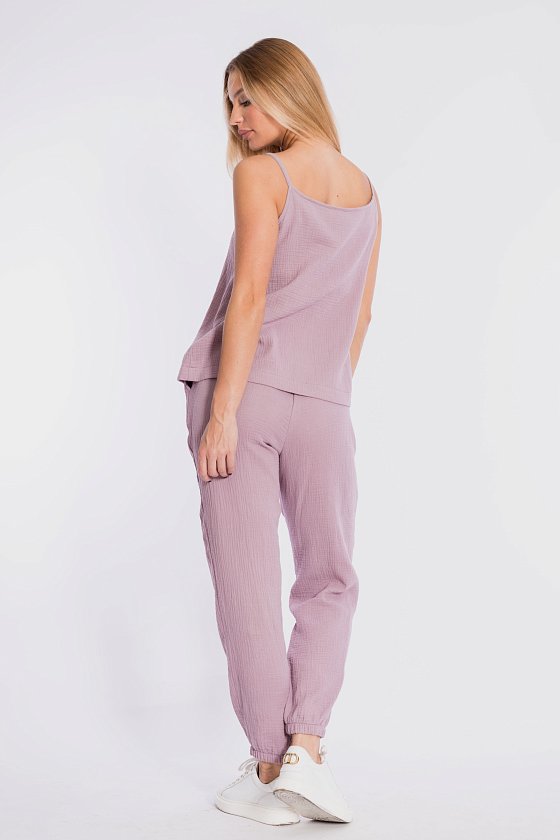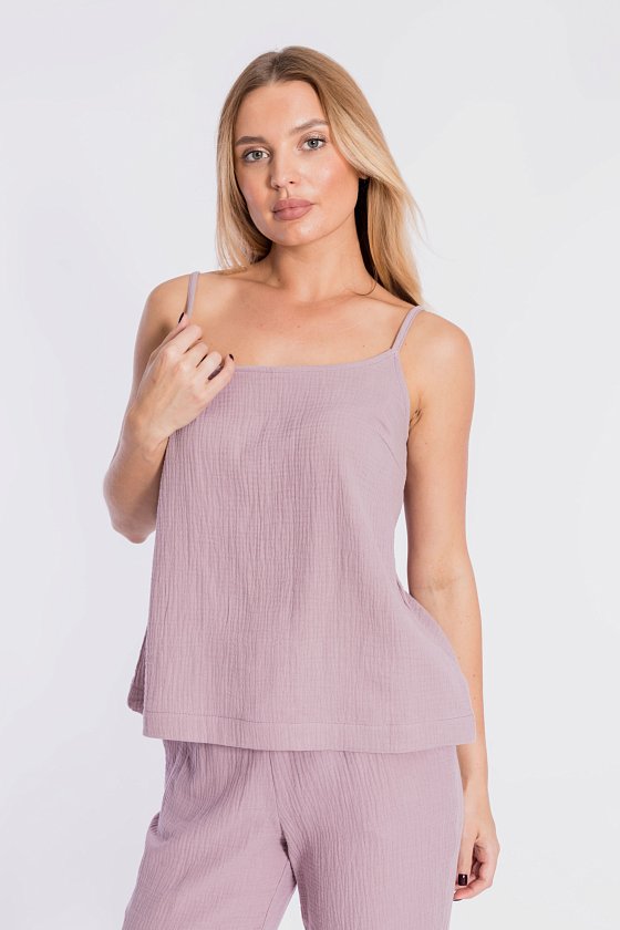 Топ свободного силуэта на тонких бретелях выполнен из хлопкового полотна - муслина.