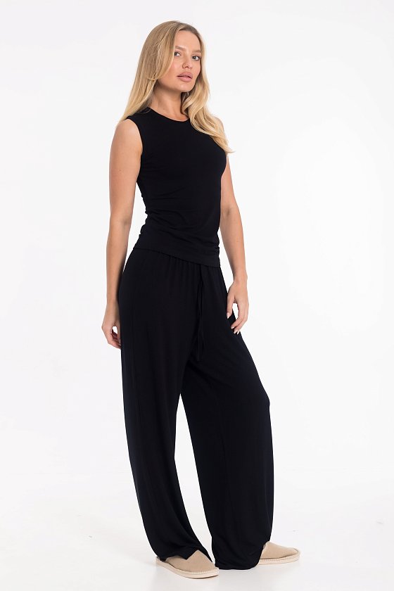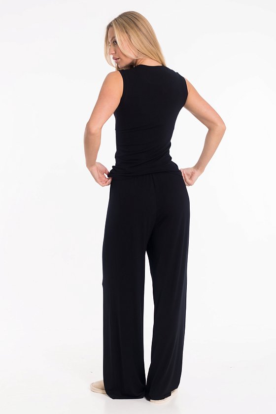 Топ женский из вискозы чёрного цвета выполнен в лаконичном классическом дизайне. Модель без рукавов с круглым вырезом горловины удобна и универсальна, легко вписывается в повседневные и стильные образы. Рекомендуем сочетать с брюками М325184а или шортами М325186а из коллекции для завершённого комплекта.