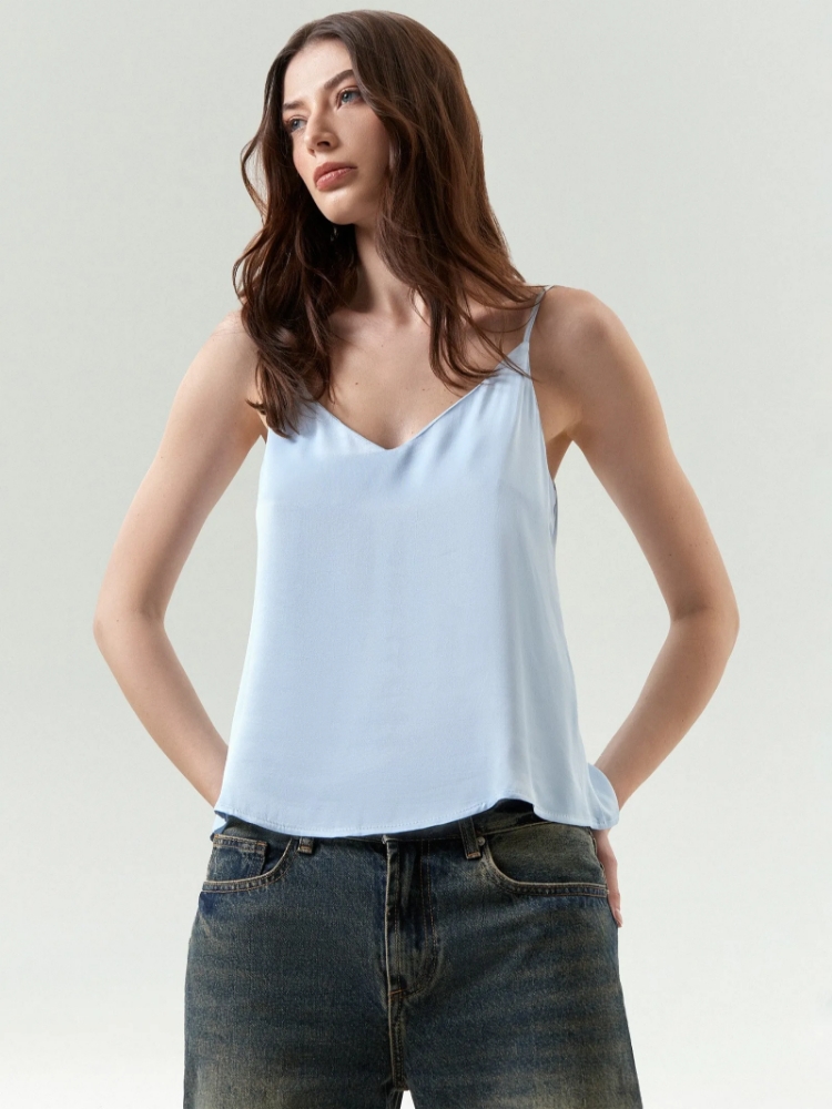 Топ в трендовом цвете — разбелённом голубом. Выполнен из тактильно приятной вискозы. Модель на регулируемых тонких бретелях имеет широкий V-образный вырез. Подойдёт к любому базовому низу