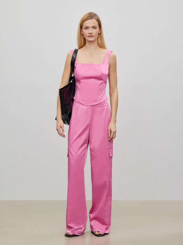 Корсетный топ в приятном глазу розовом цвете. Модель на широких бретелях с вырезом каре и открытой спиной подчеркнёт достоинства фигуры. Застёгивается на молнию сбоку. Дополнить топ можно роскошными брюками из комплекта. Изделие выполнено из материала с содержанием хлопка, без подкладки