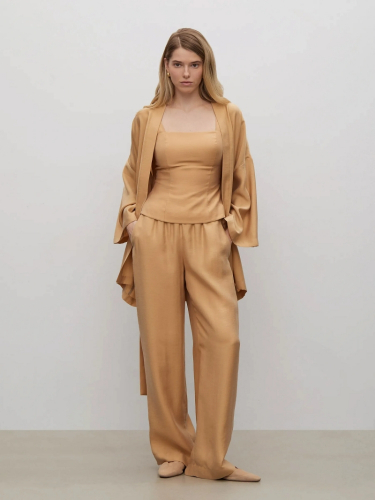 Модный корсетный топ на объемных бретелях со сборкой. Фактурный материал тёмно-синего цвета напоминает деним, но выполнен из льна и хлопка в равных пропорциях. Приталенная модель с открытой спиной подчеркивает красоту фигуры. С топом можно составить множество модных летних образов, сочетая его с брюками из комплекта, джинсами или джинсовой юбкой в тон, а также другими вариантами низа. Изделие выполнено на комфортной к телу подкладке из хлопка