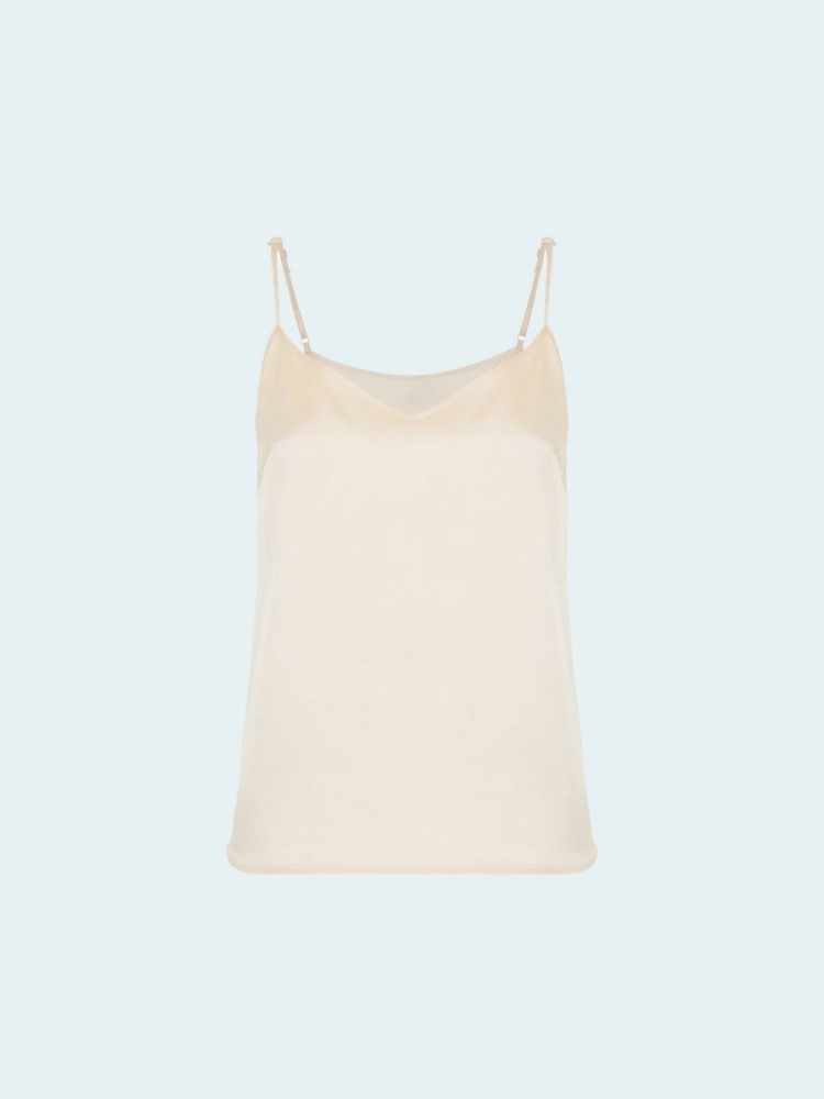 Обаятельный в своей лаконичности топ подойдёт и к празднику, и на каждый день. Атлас нежного сливочного оттенка делает образ элегантным. Лаконичная модель имеет V-образный вырез и регулируемые бретели. Топ безупречно сочетается с костюмами разных фактур, акцентными и базовыми брюками, юбками и джинсами