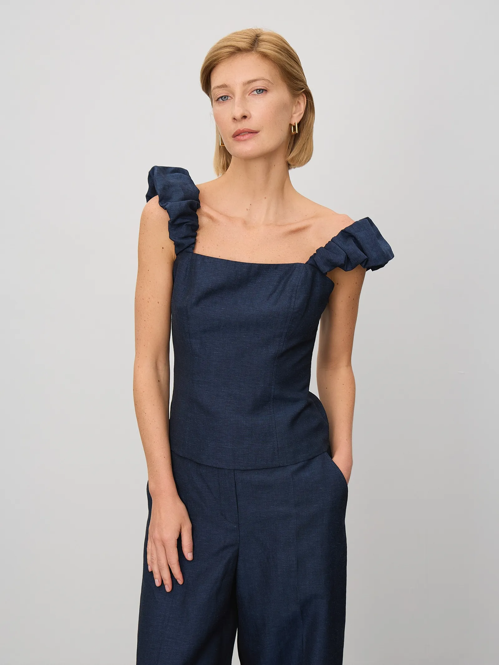 Модный корсетный топ на объемных бретелях со сборкой. Фактурный материал тёмно-синего цвета напоминает деним, но выполнен из льна и хлопка в равных пропорциях. Приталенная модель с открытой спиной подчеркивает красоту фигуры. С топом можно составить множество модных летних образов, сочетая его с брюками из комплекта, джинсами или джинсовой юбкой в тон, а также другими вариантами низа. Изделие выполнено на комфортной к телу подкладке из хлопка.