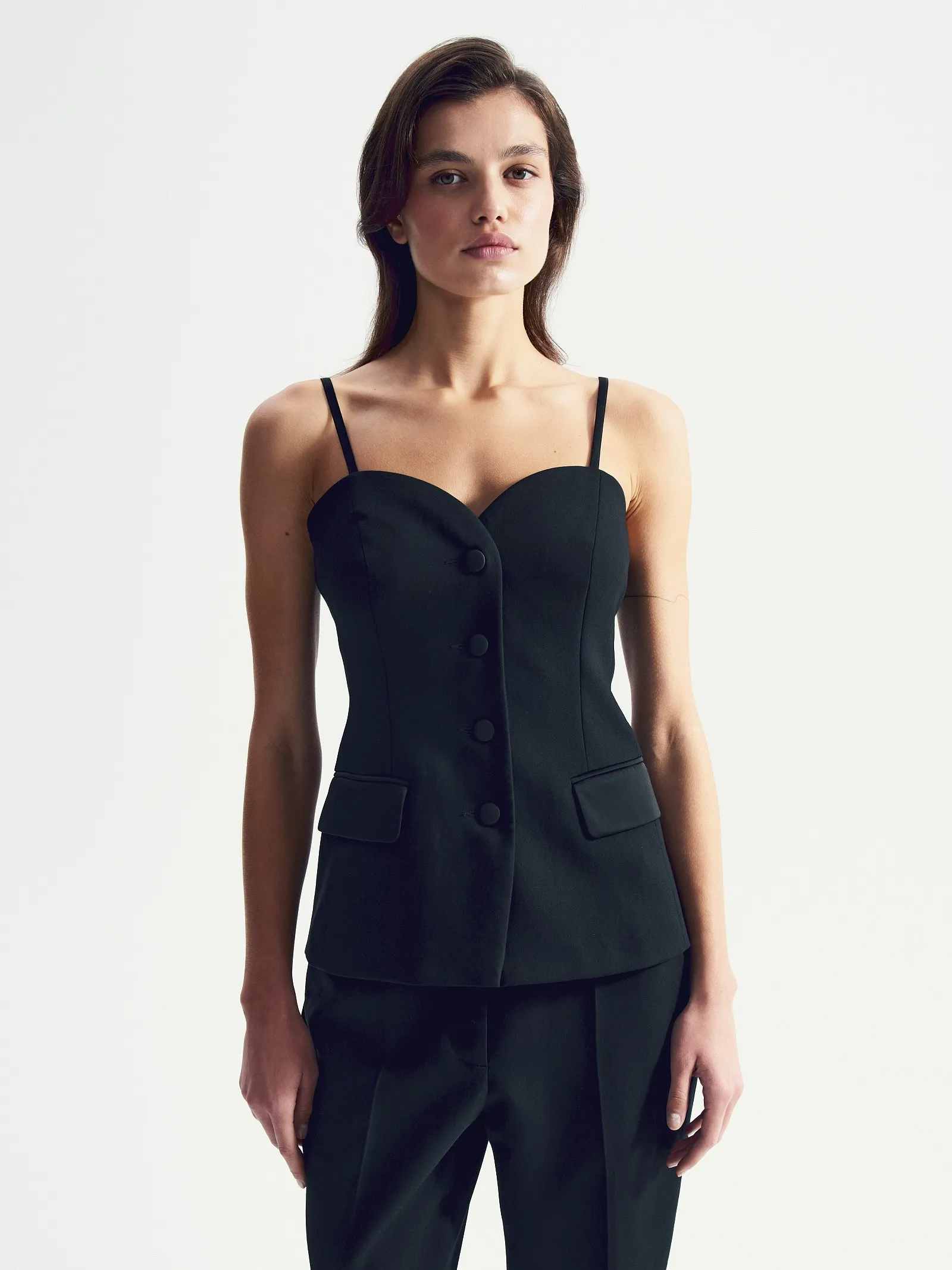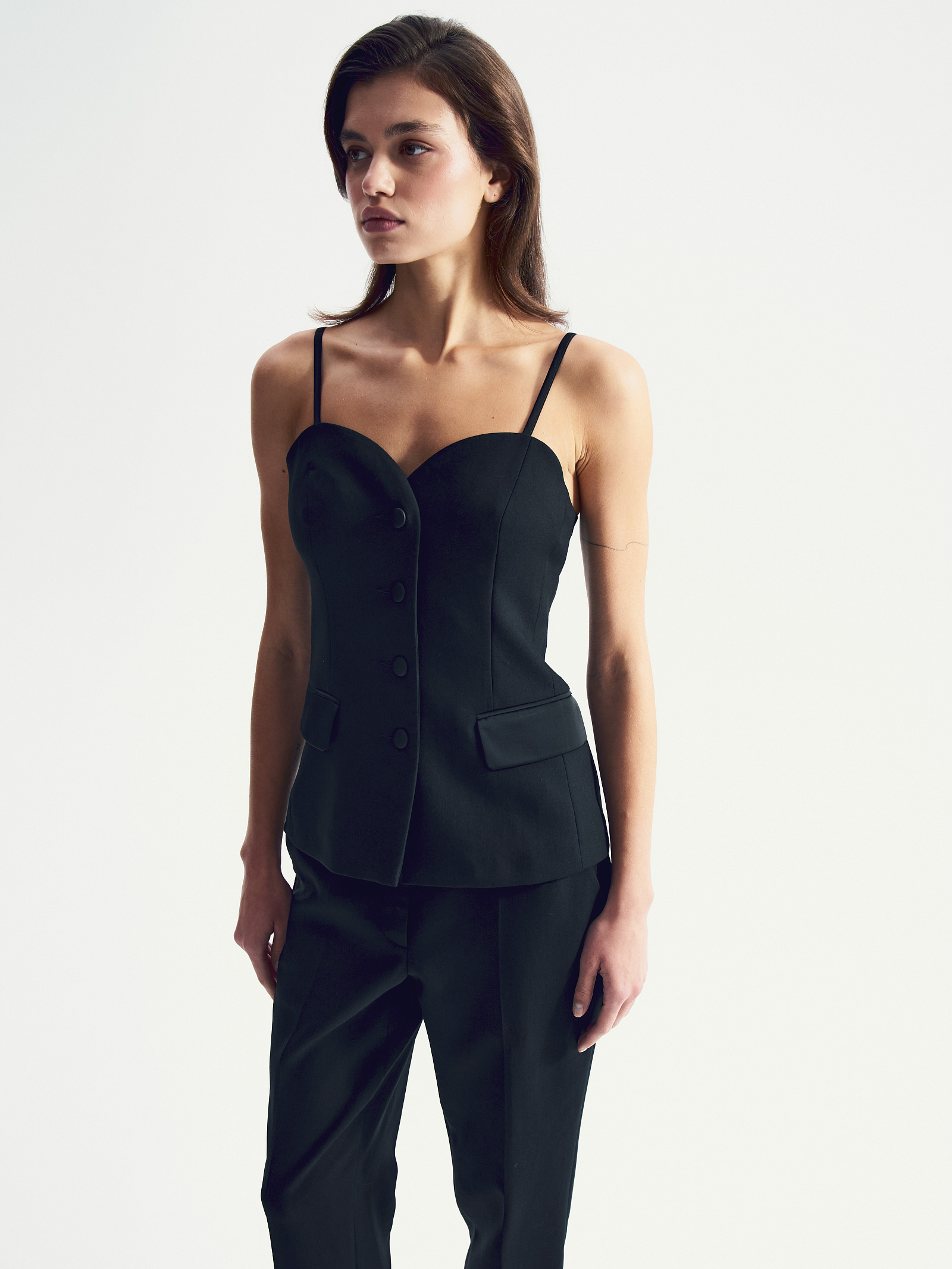 Корсетный топ на пуговицах — трендовая основа образов к любому случаю. Можно носить в составе офисного комплекта днём, дополнять эффектными колье и кулонами для вечерних и коктейльных выходов.