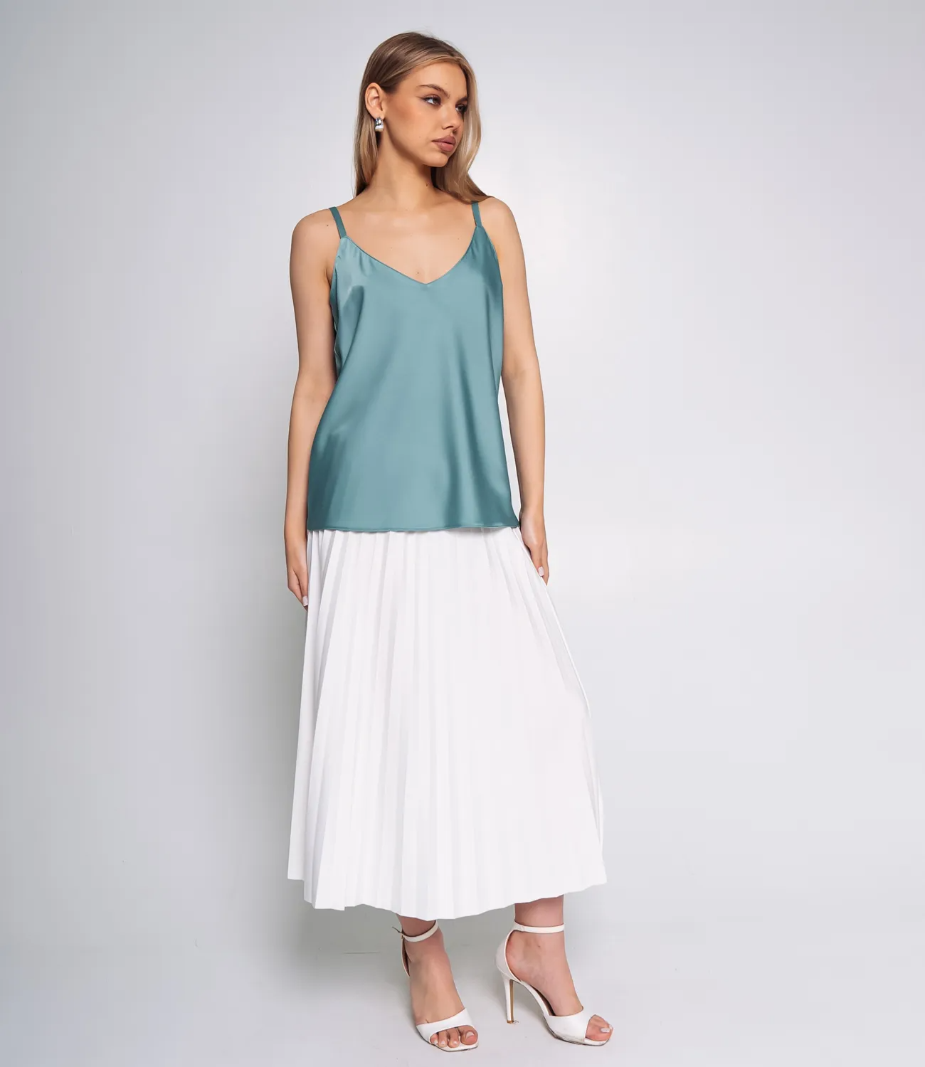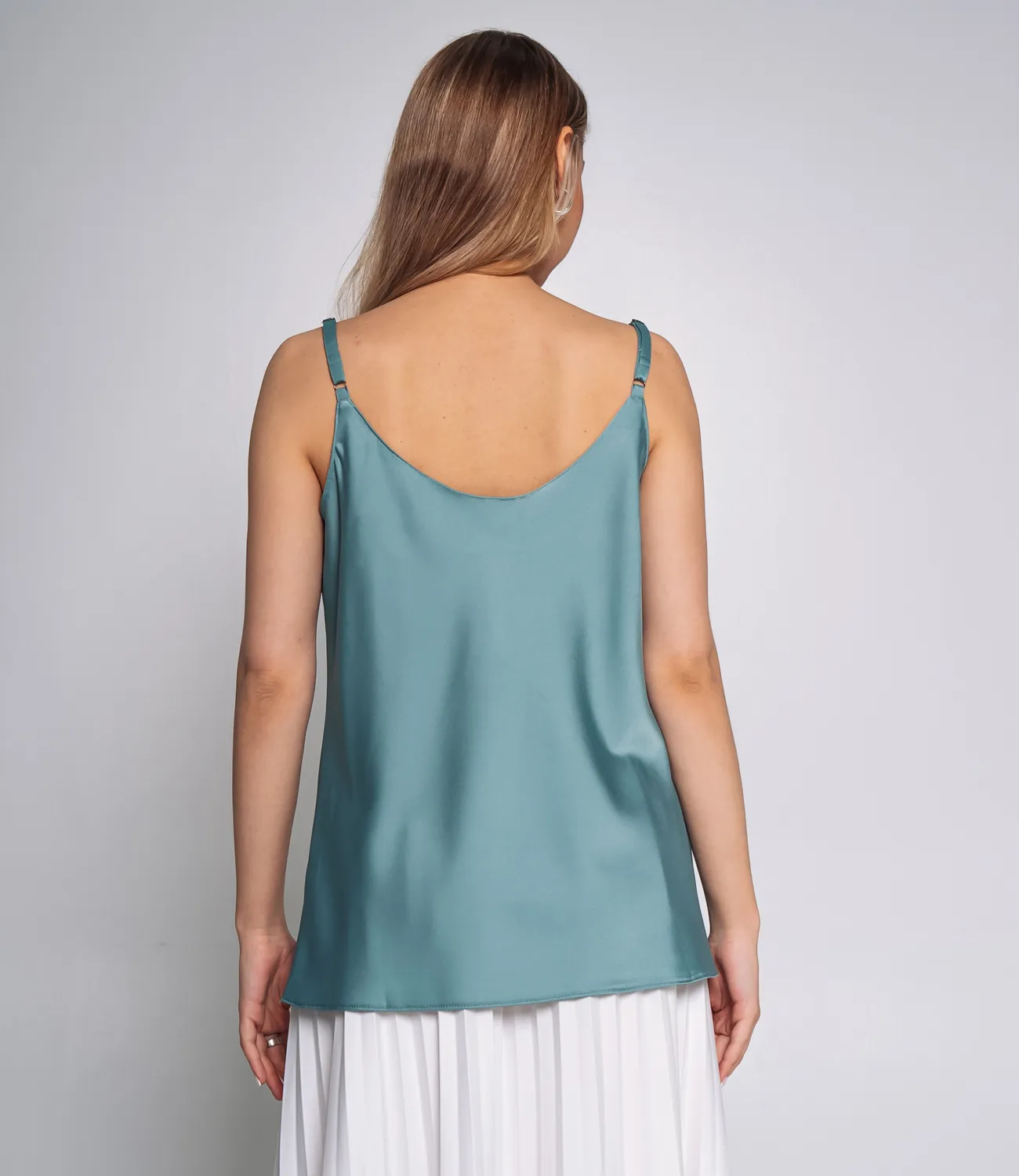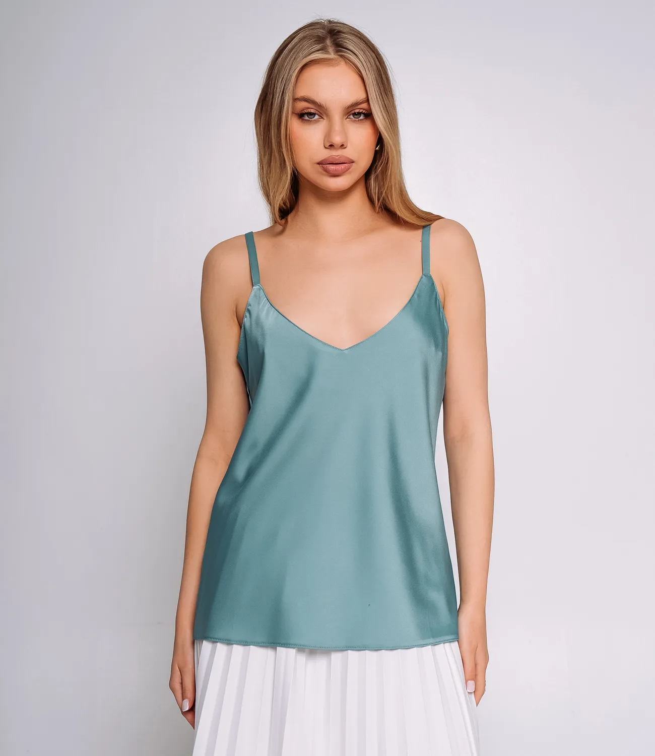 Топ – это одежда, которая подчеркивает привлекательность каждой девушки. Свободный, слегка расширенный к низу крой, который не сковывает движения и подходит для любой фигуры. Топ имеет V-образный вырез, визуально удлиняющий шею и акцентирующий внимание на декольте. Тонкие регулируемые бретели, которые позволяют подстроить изделие под индивидуальные параметры и обеспечивают удобную посадку. Минималистичный и лаконичный дизайн без дополнительных украшений, что делает этот топ универсальной базовой вещью, идеальной для создания как повседневных, так и вечерних образов. Для пошива использована ткань из 100% полиэстер , которая характеризуется отличным качеством. Даже после многих стирок изделие не утратит первоначальной привлекательности. Вы будете носить его с радостью. Обратите внимание на насыщенный цвет. Он соответствует фото на сайте. Чтобы вы были уверены в размере, мы предоставили на странице таблицу. С помощью нее вы сможете сами сделать мерки и удостовериться. Установленная нами цена является доступной. Подарите себе удовольствие быть неповторимой! Рост модели: 168, параметры: 89-63-90.