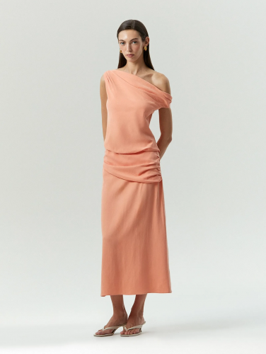 Элегантный и женственный топ станет любимой вещью в летнем гардеробе. Роскошный цвет мякоти папайи очень актуален в этом сезоне и всегда отлично поднимает настроение. Он освежает портретную зону, придаёт здоровое сияние, подчёркивает красоту загара. Удобен в стилизациях: его легко сочетать с оттенками бежевого и оливкового, которые найдутся в любом гардеробе, а также с модным оттенком сливочного масла. Материал более чем наполовину состоит из тенсела, а дополняют его вискоза и лён. Ткань красиво облегает тело и хорошо драпируется. Драпировки в нижней части топа сделаны так, чтобы создавать эффект цельного платья вместе с юбкой из комплекта. Драпировки в верхней части подчёркивают зону декольте и плеч. Одно плечо приспущено, чтобы добавить образу чувственности. Топ составит идеальный тандем с юбкой из комплекта, но также органично смотрится с разными вариантами низа, от цветного и базового денима до летних льняных брюк или твидовых юбок в базовых расцветках. Может стать частью капсулы с платьем dous.