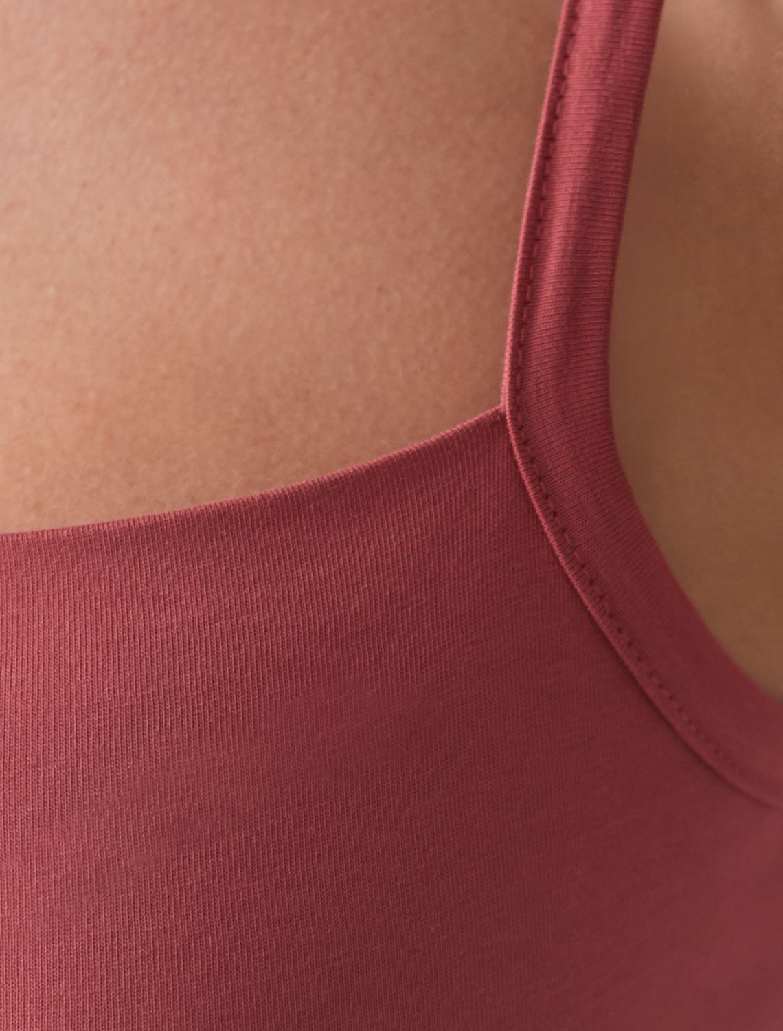 Стильный и базовый топ темно-кораллового цвета полуприлегающего кроя идеально подходит для девушек и женщин всех возрастов. Двуслойная зона бра. Линия декольте образована посредством сгиба полотна без отсрочки и закреплением обоих слоев в шве проймы. Удобные регулируемые бретели. Прямой силуэт подходит любому типу фигуры. Квадратный вырез горловины - тренд этого сезона. Он выполнен из качественной дышащей ткани, что обеспечивает комфорт в жаркую погоду. Однотонный дизайн позволяет легко сочетать его с различными предметами гардероба, создавая элегантный повседневный образ.