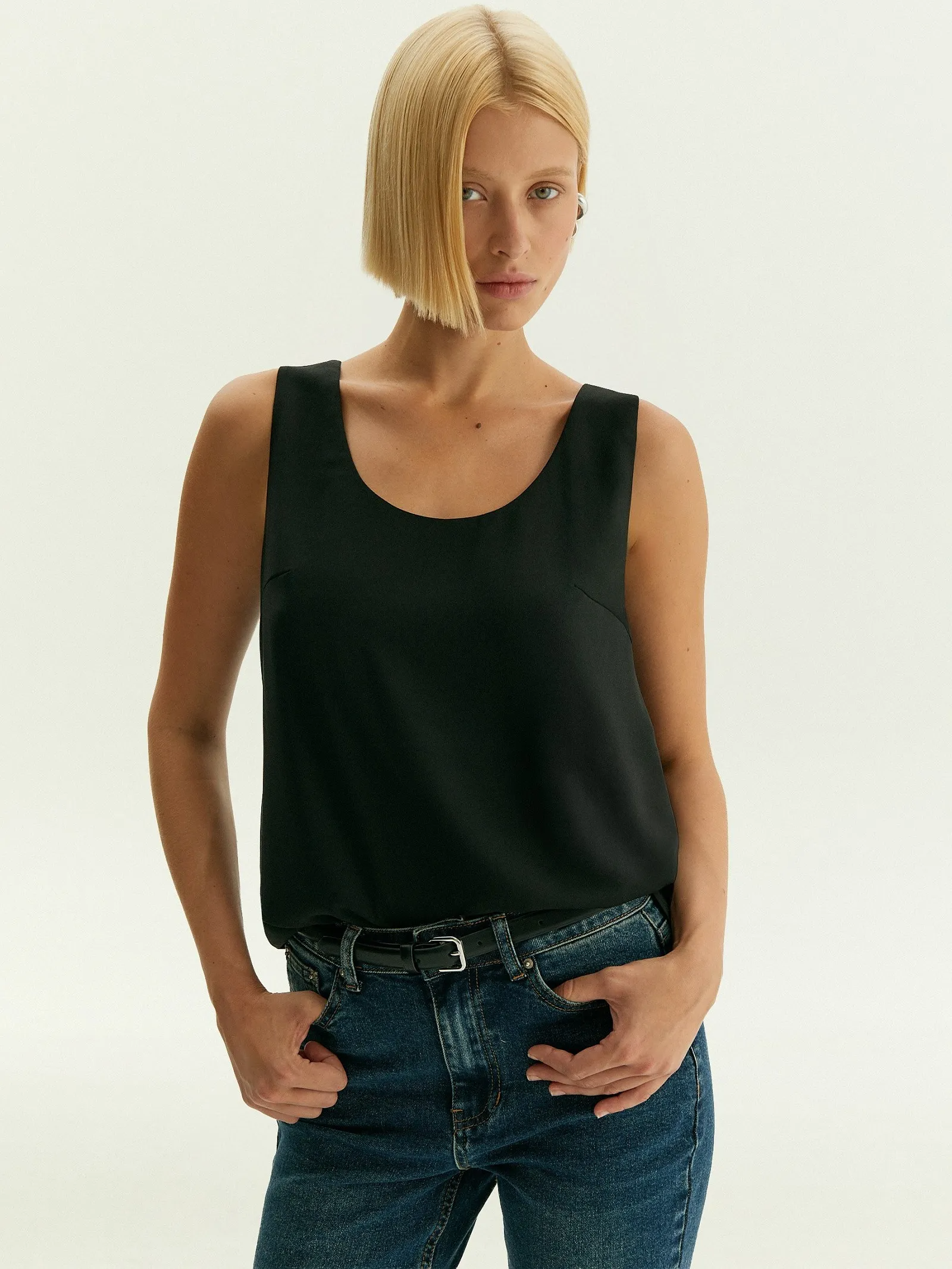 Чёрный топ с U-вырезом смотрится актуально и стильно. Модель без застёжек в меру свободна, не стесняет движений, удобна под жакеты и без них. Топ сделан на подкладке.