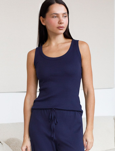 Базовый топ темно-синего цвета с круглым вырезом выполнен из фактурного трикотажа в рубчик. Особенность полотна - трикотаж кашкорсе удивительной мягкости, намного мягче стандартных вариантов, подходящий для расслабленных домашних и пижамных образов. Хлопок обеспечивает максимальный комфорт даже в течение длительного времени и позволяет коже дышать, а эластан в составе позволяет ткани подстраиваться под особенности фигуры. Майка подойдет для девушек и женщин, которые ценят уют и удобство. Нежная ткань приятна к телу, не вызывает дискомфорта и позволяет коже дышать, что особенно важно в повседневной жизни. Рубчик визуально вытягивает силуэт и делает фигуру более стройной, а широкие лямки не доставляют дискомфорта и хорошо держат форму. Разнообразие размеров позволяет выбрать подходящий вариант для любых параметров, в том числе на большие размеры. Этот повседневный топ практичен и незаменим для тех, кто ищет качественные вещи на каждый день.