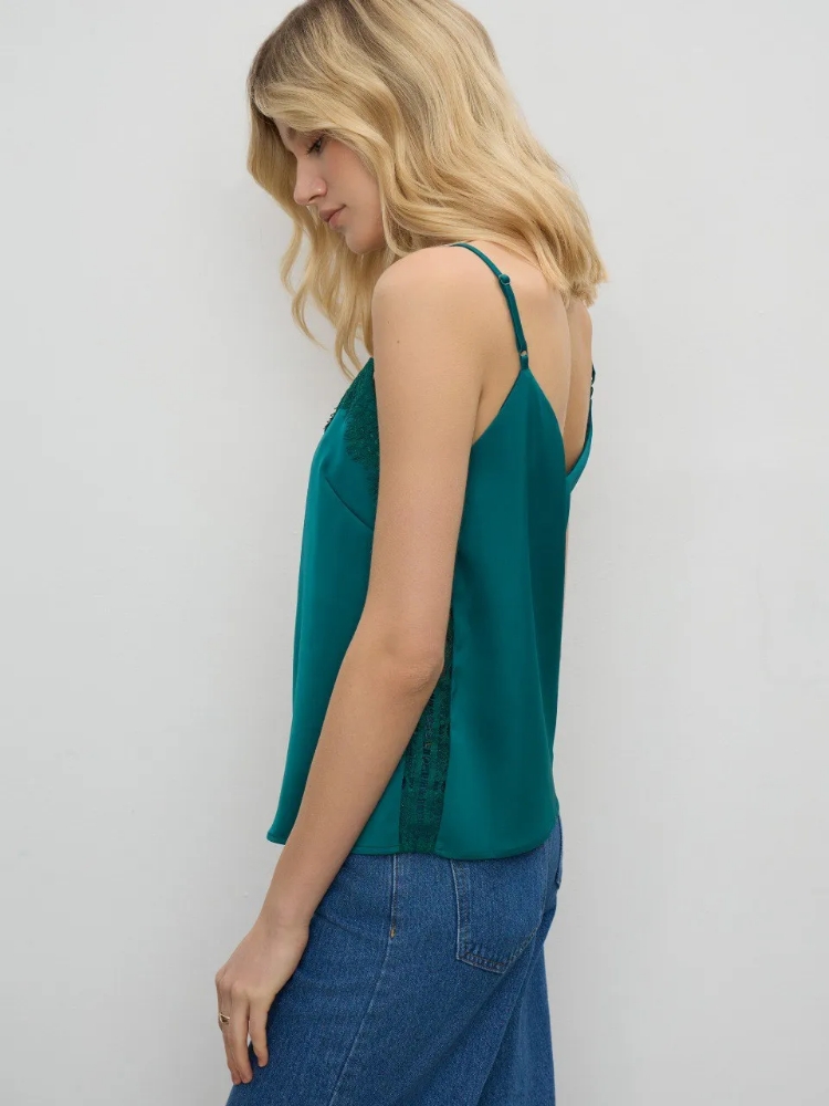 Бирюзовый топ с тонкой кружевной отделкой станет любимой вещью в гардеробе. Шелковистый струящийся материал усиливает чувственность образа. На груди располагаются аккуратные вытачки, добавляющие изящества. Модель прямого кроя на тонких бретелях с V-вырезом спереди и открытой спиной удобно использовать как первый слой в самых разных образах. Изделие выполнено на подкладке