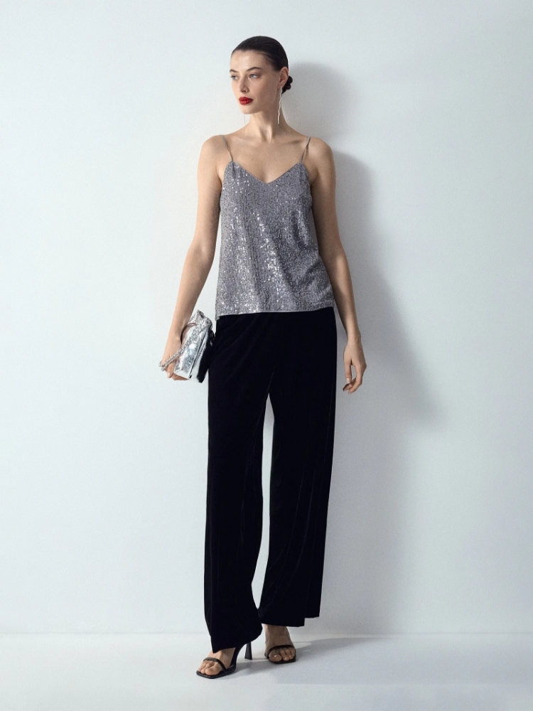 Сияющий топ станет отличным выбором к особому случаю. Он отличается интересной игрой цвета: серебристо-серый оттенок с лёгким лиловым отливом притягивает взгляд. Полупрозрачный верхний слой украшен плотными рядами сверкающих пайеток. Под ним находится приятная к телу подкладка. Удобная модель на тонких бретелях идеальна под жакеты. Бретели регулируются. Топ можно дополнить практически любым низом: узкими и широкими джинсами, базовой юбкой-карандаш из костюмной ткани и атласной юбкой макси, а также другими вариантами по вкусу