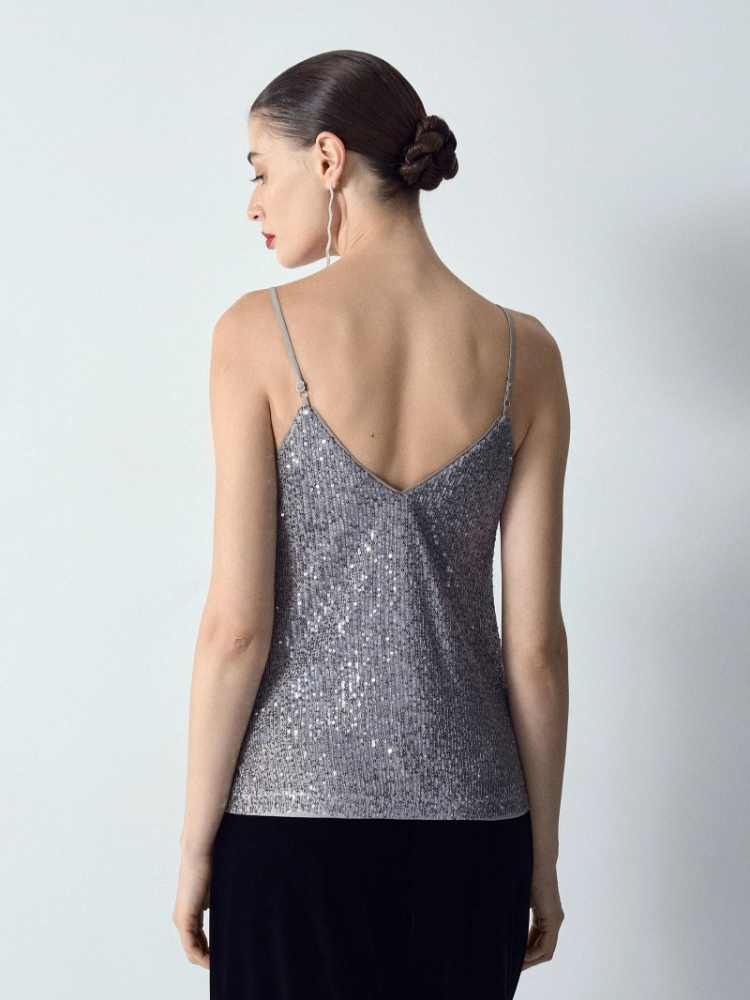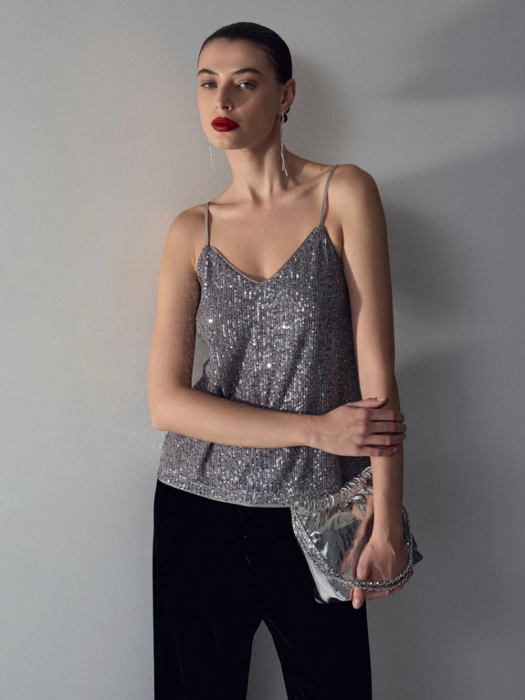 Сияющий топ станет отличным выбором к особому случаю. Он отличается интересной игрой цвета: серебристо-серый оттенок с лёгким лиловым отливом притягивает взгляд. Полупрозрачный верхний слой украшен плотными рядами сверкающих пайеток. Под ним находится приятная к телу подкладка. Удобная модель на тонких бретелях идеальна под жакеты. Бретели регулируются. Топ можно дополнить практически любым низом: узкими и широкими джинсами, базовой юбкой-карандаш из костюмной ткани и атласной юбкой макси, а также другими вариантами по вкусу