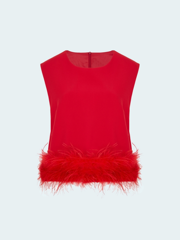 Коктейльный топ в красном цвете с двойным рядом перьев по низу. Укороченная прямая модель с круглым вырезом отлично подойдёт к брюкам или юбкам с завышенной посадкой. С топом можно собирать запоминающиеся монохромные образы или сделать его единственным акцентом образа. Изделие выполнено на подкладке. Перьевой декор не отстёгивается