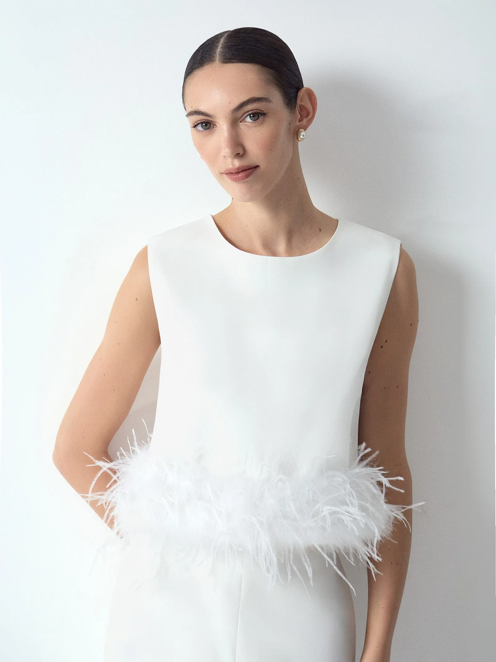 Коктейльный топ в белом цвете с двойным рядом перьев по низу. Укороченная прямая модель с круглым вырезом отлично подойдёт к брюкам или юбкам с завышенной посадкой. С топом можно собирать запоминающиеся монохромные образы или сделать его единственным акцентом образа. Изделие выполнено на подкладке. Перьевой декор не отстёгивается.