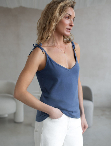 Топ с V-вырезом на регулируемых бретелях-завязках из фактурного 100% хлопка флам D43.235 св.синий