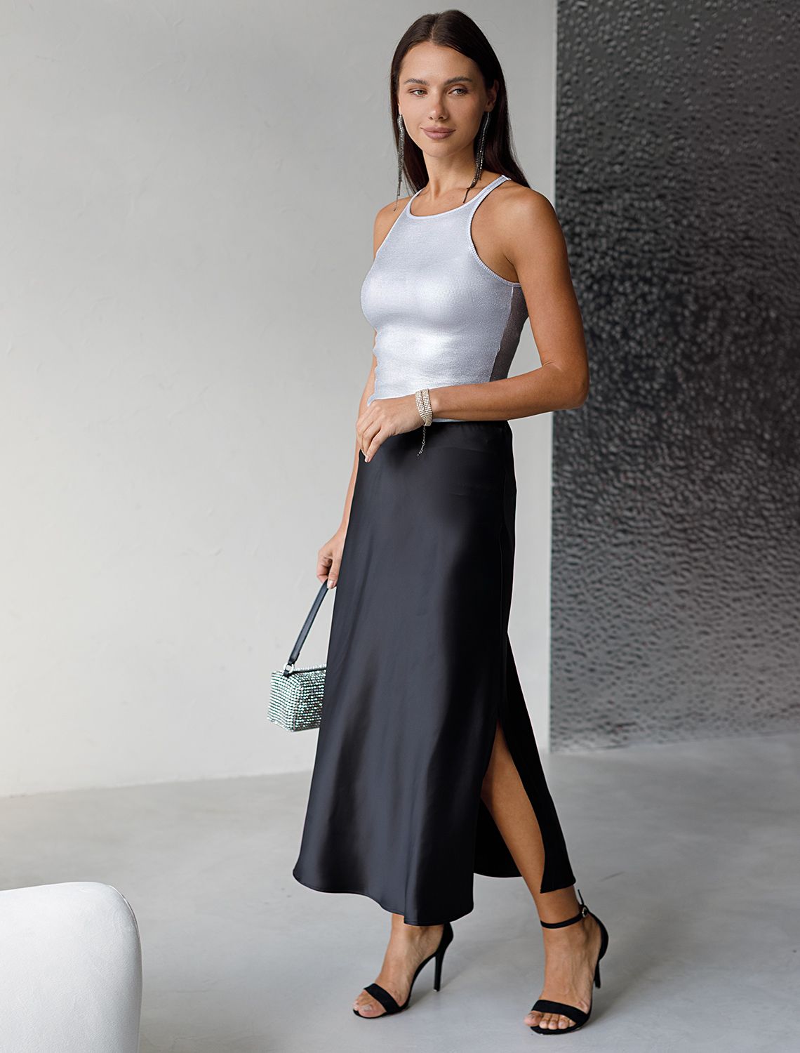 Натуральный дышащий материал обеспечивает комфортный микроклимат на протяжении всего дня, не вызывая дискомфорта даже при длительном ношении. Износостойкое покрытие сохраняет блеск и привлекательность майки несмотря на частое использование. Топ прекрасно сочетается с деловым костюмом или аксессуарами, позволяя создавать как строгие, так и вечерние образы. матовое серебро