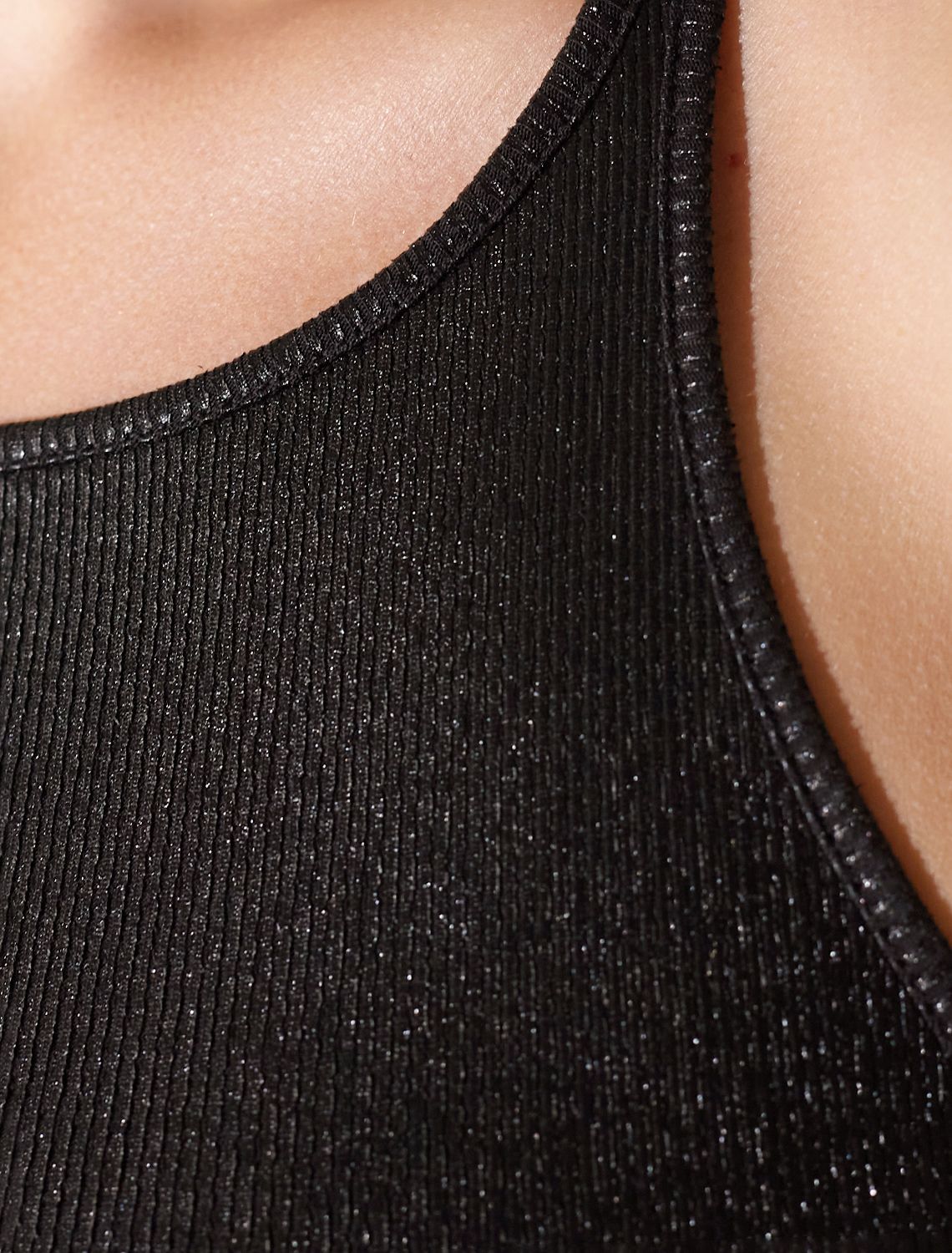 Эффектный топ черного цвета из мягкого хлопка с эластаном представлен в стильном исполнении с матовым покрытием металлик. Мелкий рубчик визуально вытягивает силуэт и подчеркивает фигуру, делая образ более стройным и аккуратным. Круглый ворот и суженные лямки акцентируют внимание на линии ключиц, делая образ утонченным и изысканным, Благодаря деликатному блеску топ подходит для тех, кто ценит утонченность и стремится добавить в образ немного сияния без перебора - это отличный вариант топа для любительниц минимализма.
