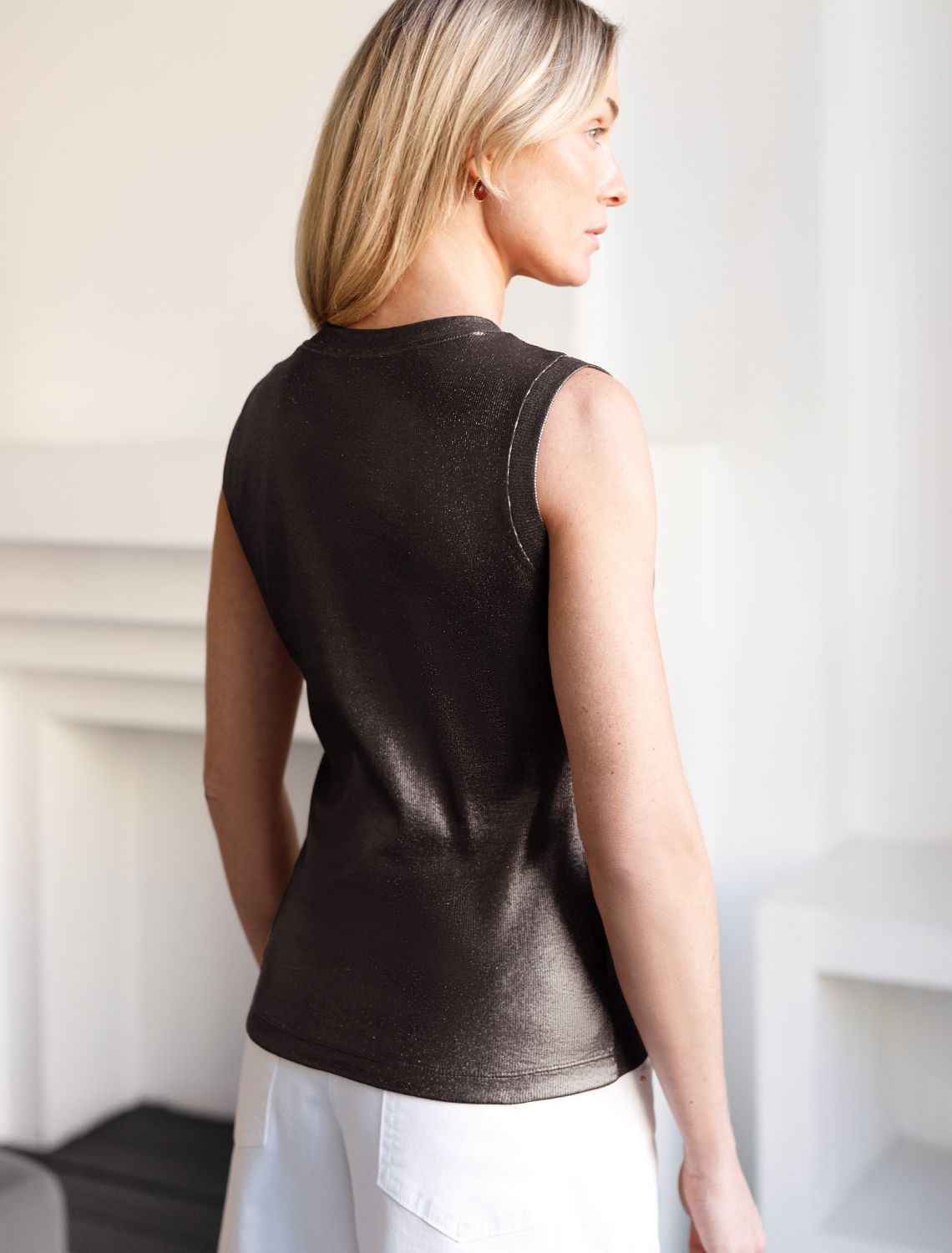 Трендовый матовый металлизированный эффект создает сияющий блеск без излишней яркости — это делает топ нарядным и красивым как для праздничного события, так и для повседневной носки в комплекте с деловым костюмом или джинсами. Широкие лямки обеспечивают дополнительный комфорт в течение всего дня. Круглый ворот подчеркивает линию шеи, добавляя образу изысканности.