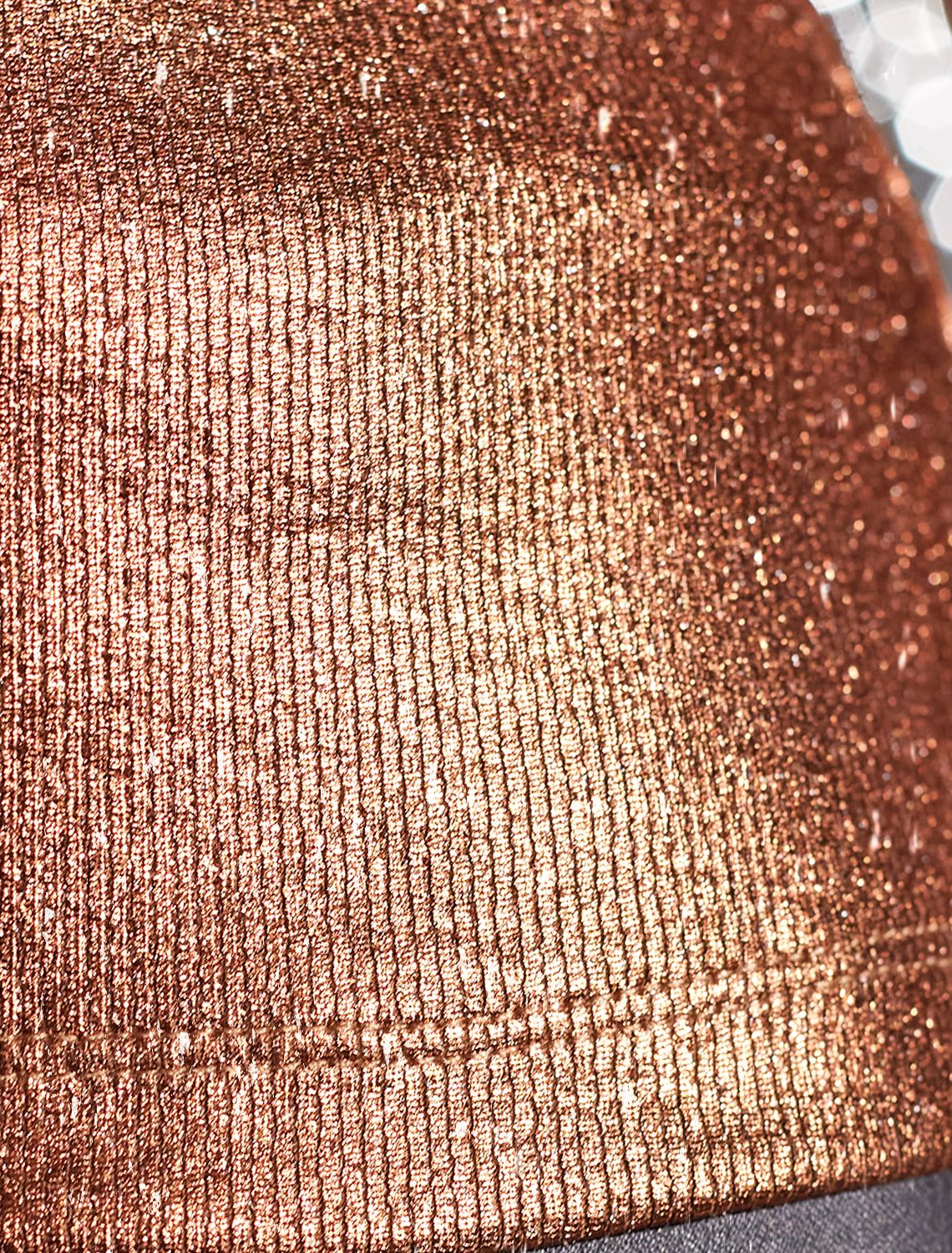 Трендовый матовый металлизированный эффект создает сияющий бронзовый блеск с серебристыми вкраплениями без излишней яркости — это делает топ нарядным и красивым как для праздничного события, так и для повседневной носки в комплекте с деловым костюмом или джинсами. Широкие лямки обеспечивают дополнительный комфорт в течение всего дня. Круглый ворот подчеркивает линию шеи, добавляя образу изысканности.