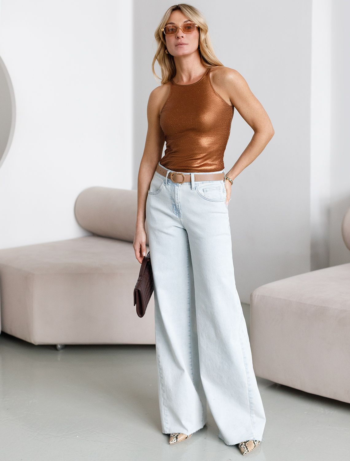 Эффектный топ кофейного цвета из мягкого хлопка с эластаном представлен в стильном исполнении с матовым бронзовым покрытием металлик с серебристыми вкраплениями. Мелкий рубчик визуально вытягивает силуэт и подчеркивает фигуру, делая образ более стройным и аккуратным. Круглый ворот и суженные лямки акцентируют внимание на линии ключиц, делая образ утонченным и изысканным, Благодаря деликатному блеску топ подходит для тех, кто ценит утонченность и стремится добавить в образ немного сияния без перебора - это отличный вариант топа для любительниц минимализма.
