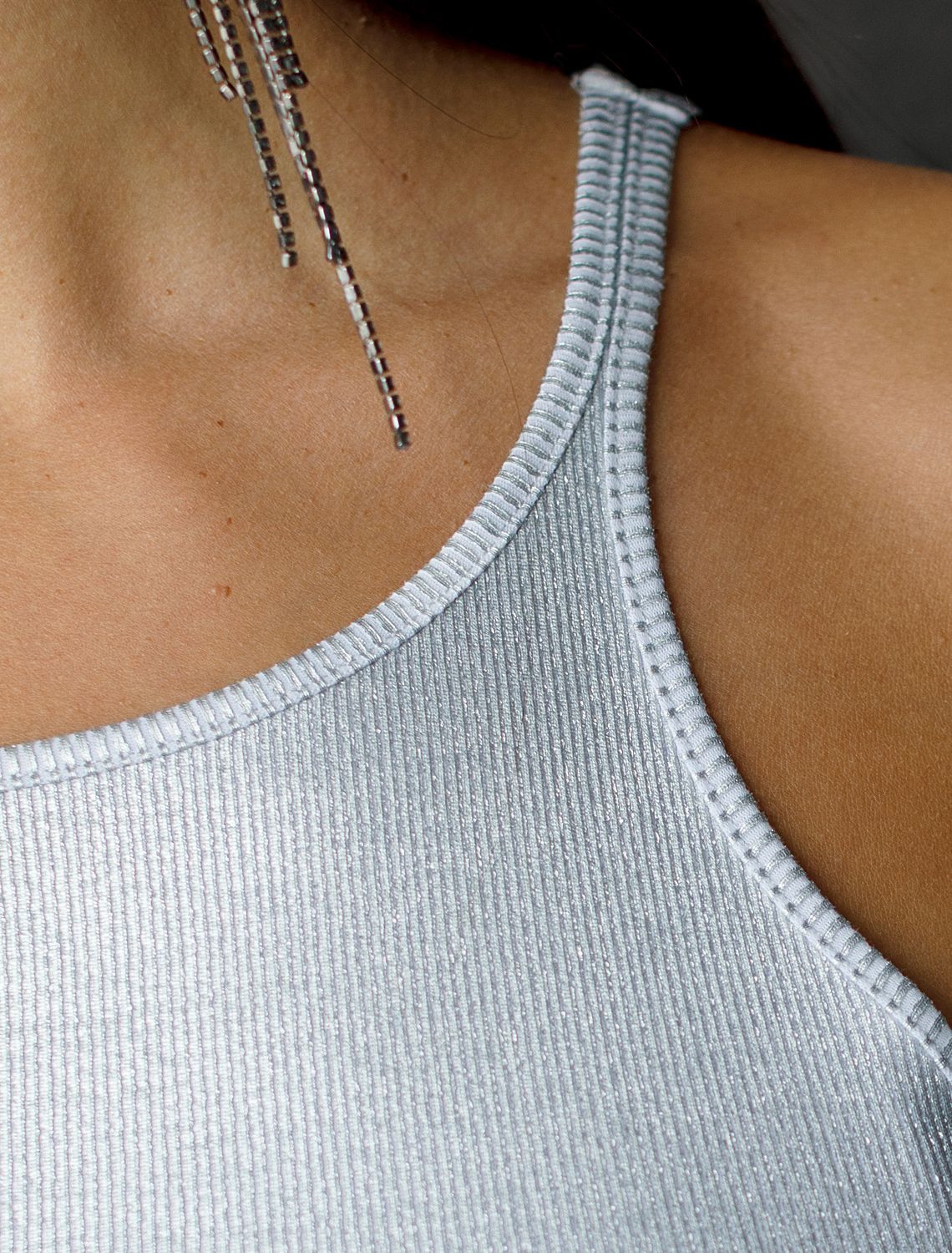 Эффектный топ серебристого цвета из мягкого хлопка с эластаном представлен в стильном исполнении с матовым покрытием металлик. Мелкий рубчик визуально вытягивает силуэт и подчеркивает фигуру, делая образ более стройным и аккуратным. Круглый ворот и суженные лямки акцентируют внимание на линии ключиц, делая образ утонченным и изысканным, Благодаря деликатному блеску топ подходит для тех, кто ценит утонченность и стремится добавить в образ немного сияния без перебора - это отличный вариант топа для любительниц минимализма.