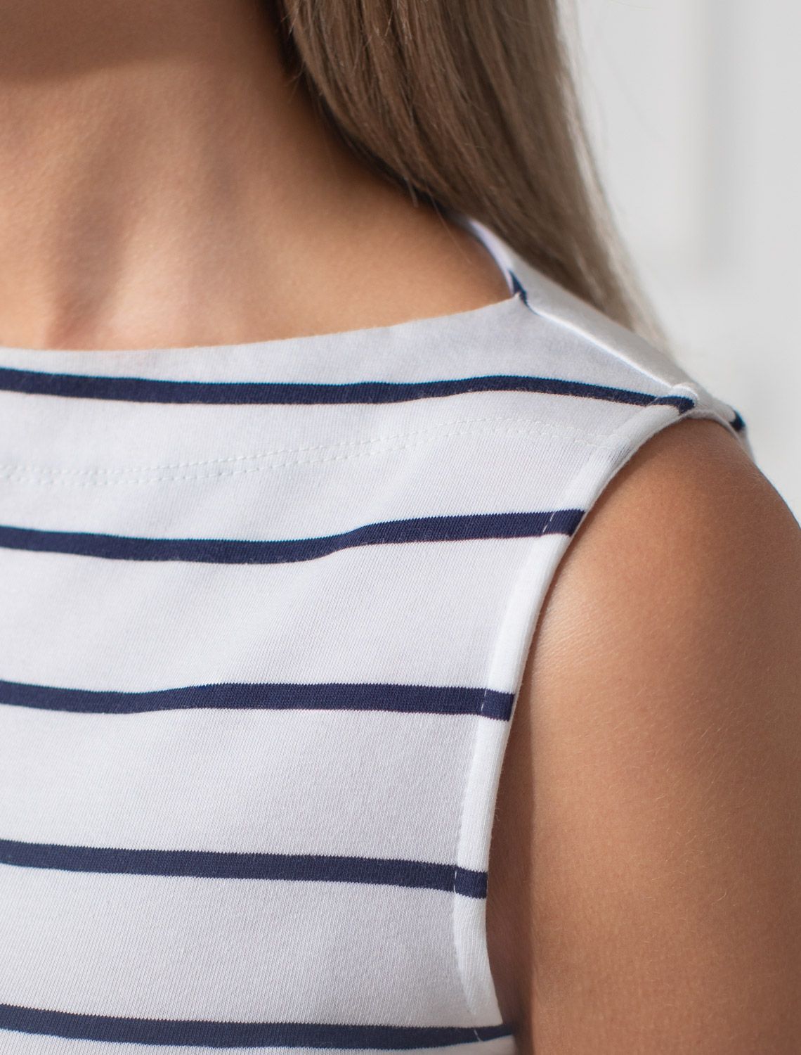 Топ белого цвета в темно-синюю полоску с вырезом лодочка выполнен из премиального эластичного хлопка плотностью 170 Г/м2. Прямой силуэт подходит любому типу фигуры, в том числе и на большие размеры. Вырез лодочка придает образу изысканность и стиль. Полоска всегда актуальна и добавляет базовому топу эффектности. Благодаря тому, что материал тянется, топ хорошо садится по фигуре и обеспечивает комфорт на протяжении всего дня. Эластичное полотно мягко обхватывает силуэт, не стесняя движений. Приятный к телу хлопок не вызывает раздражения и подходит для ежедневной носки. Сочетание гладкой текстуры и эластичных свойств позволяет топу выглядеть аккуратно и стильно даже после множества стирок. Длинная майка без рукавов идеально подойдет для создания свежих и модных образов на каждый день.