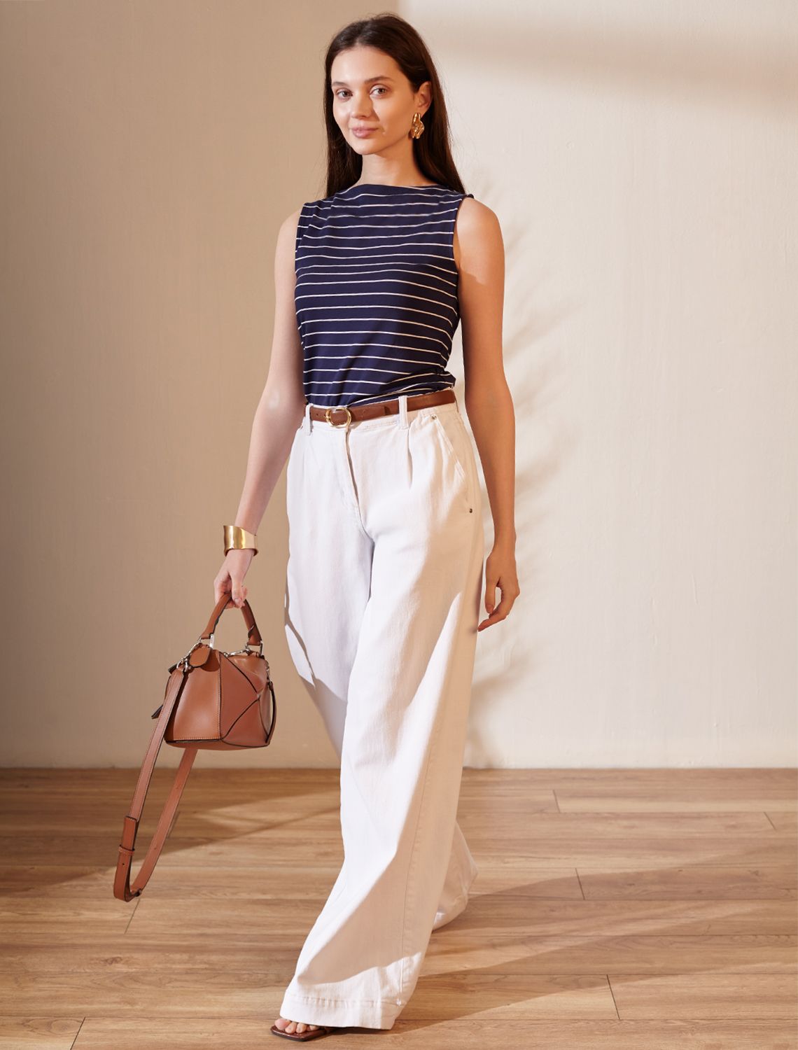 Топ темно-синего цвета в белую полоску с вырезом лодочка выполнен из премиального эластичного хлопка плотностью 170 Г/м2. Прямой силуэт подходит любому типу фигуры, в том числе и на большие размеры. Вырез лодочка придает образу изысканность и стиль. Полоска всегда актуальна и добавляет базовому топу эффектности. Благодаря тому, что материал тянется, топ хорошо садится по фигуре и обеспечивает комфорт на протяжении всего дня. Эластичное полотно мягко обхватывает силуэт, не стесняя движений. Приятный к телу хлопок не вызывает раздражения и подходит для ежедневной носки. Сочетание гладкой текстуры и эластичных свойств позволяет топу выглядеть аккуратно и стильно даже после множества стирок. Длинная майка без рукавов идеально подойдет для создания свежих и модных образов на каждый день.