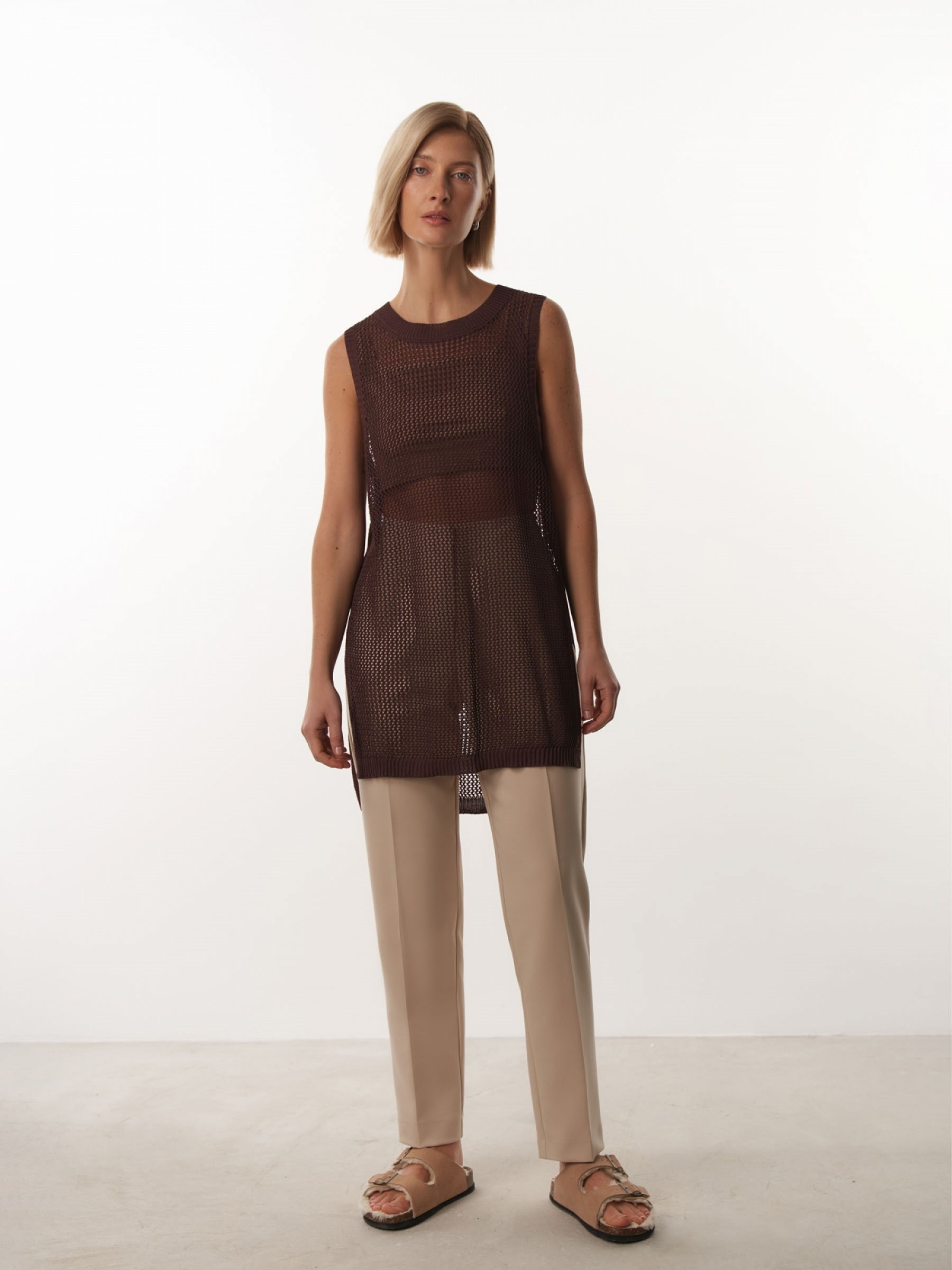Оригинальный удлиненный топ – характерный и стильный. Необычная сетчатая вязка вносит в образ нотки футуристичности и точно привлечет внимание. Отлично сочетается с футболкой, водолазкой, рубашкой, брюками и джинсами. Удлиненная спинка и боковые разрезы добавляет луку легкую небрежность. Материал – качественный сетчатый трикотаж на основе вискозы. . Круглая горловина, пройма и низ изделия декорированы фактурной резинкой в тон. По бокам – полосы гладкой вязки, которые эффектно контрастируют с крупной сеткой основного полотна. Три универсальных базовых цвета на выбор. 89% вискоза, 11% нейлон