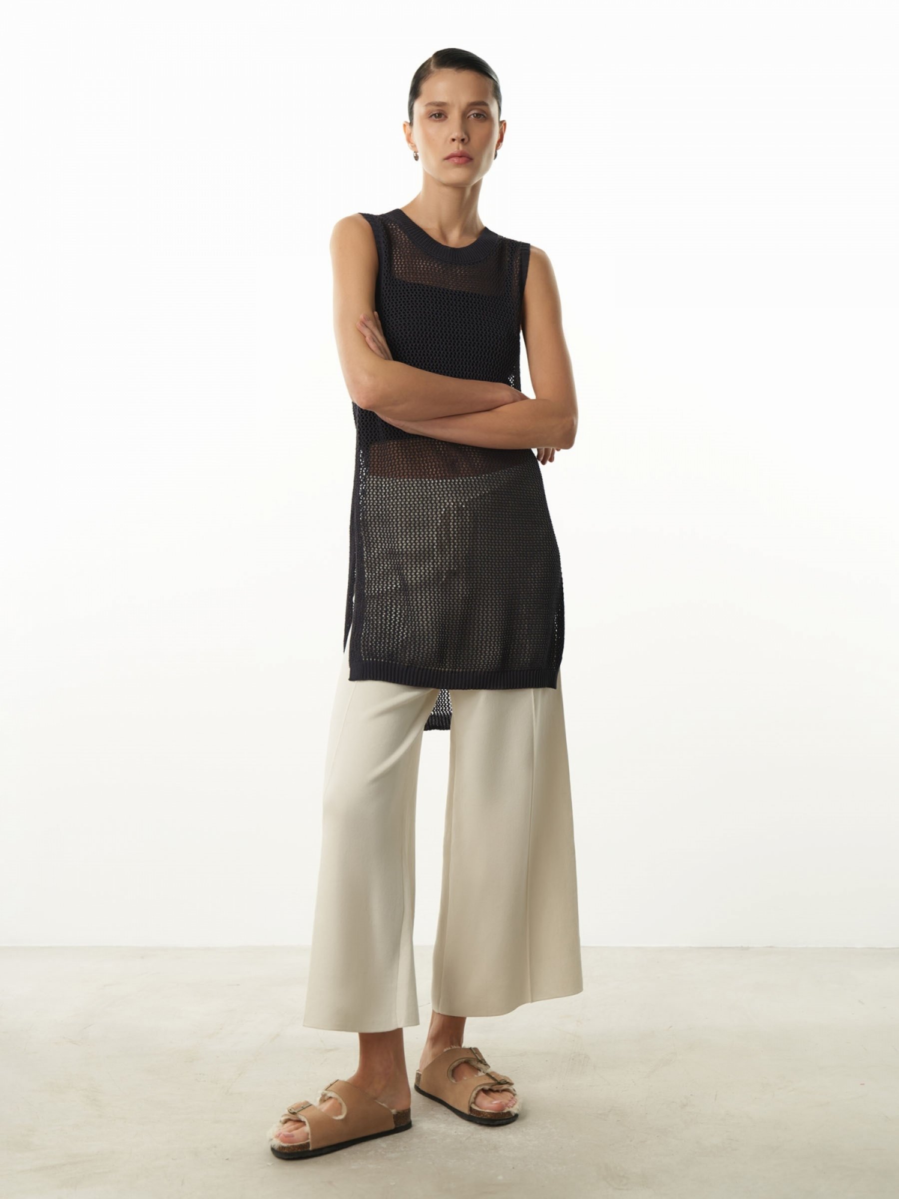 Оригинальный удлиненный топ – характерный и стильный. Необычная сетчатая вязка вносит в образ нотки футуристичности и точно привлечет внимание. Отлично сочетается с футболкой, водолазкой, рубашкой, брюками и джинсами. Удлиненная спинка и боковые разрезы добавляет луку легкую небрежность. Материал – качественный сетчатый трикотаж на основе вискозы. . Круглая горловина, пройма и низ изделия декорированы фактурной резинкой в тон. По бокам – полосы гладкой вязки, которые эффектно контрастируют с крупной сеткой основного полотна. Три универсальных базовых цвета на выбор. 89% вискоза, 11% нейлон