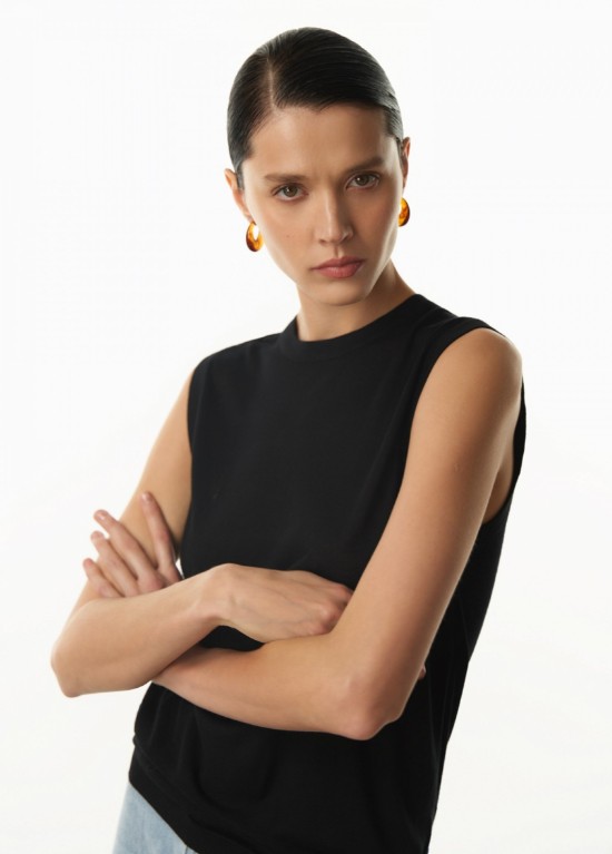 Топ классической длины полуприлегающего силуэта – расслабленный и лаконичный. Выполнен из легкого трикотажа на основе 100% вискозы. Круглая горловина и проймы декорированы гладкой резинкой в тон. Низ – фактурной резинкой также в тон. Модель выполнена в базовых и акцентных цветах, выбирайте под лук и настроение. 100% вискоза