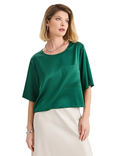 Укороченный топ свободного кроя с коротким рукавом , круглым вырезом горловины не стесняет движений, хорошо садится по фигуре женщины любого телосложения. Аккуратные швы совершенно не ощущаются при носке. Предусмотрен функциональный нагрудный карман. Мягкие линии подчеркивают женственность, ткань с благородным блеском и струящейся фактурой с градиентными переливами привлекает восхищенные взгляды. В этой одежде вы будете выглядеть изящно и привлекательно и при этом чувствовать себя максимально комфортно и уверенно. Шелковый топ соответствует принципам sustainable fashion – это прекрасное приобретение для личного гардероба, которое будет актуально всегда. А также превосходный подарок со вкусом для особых персон и случаев.