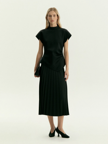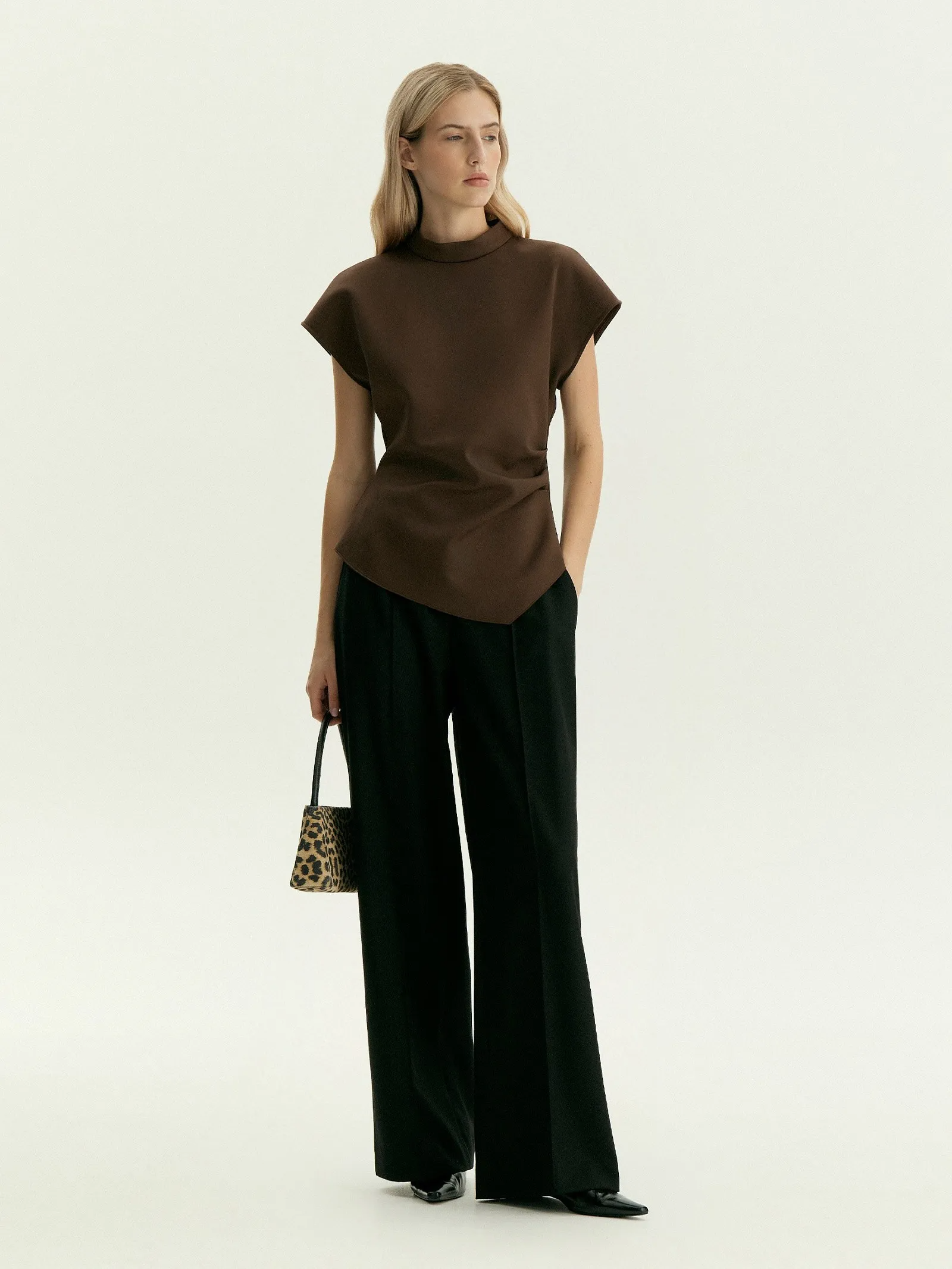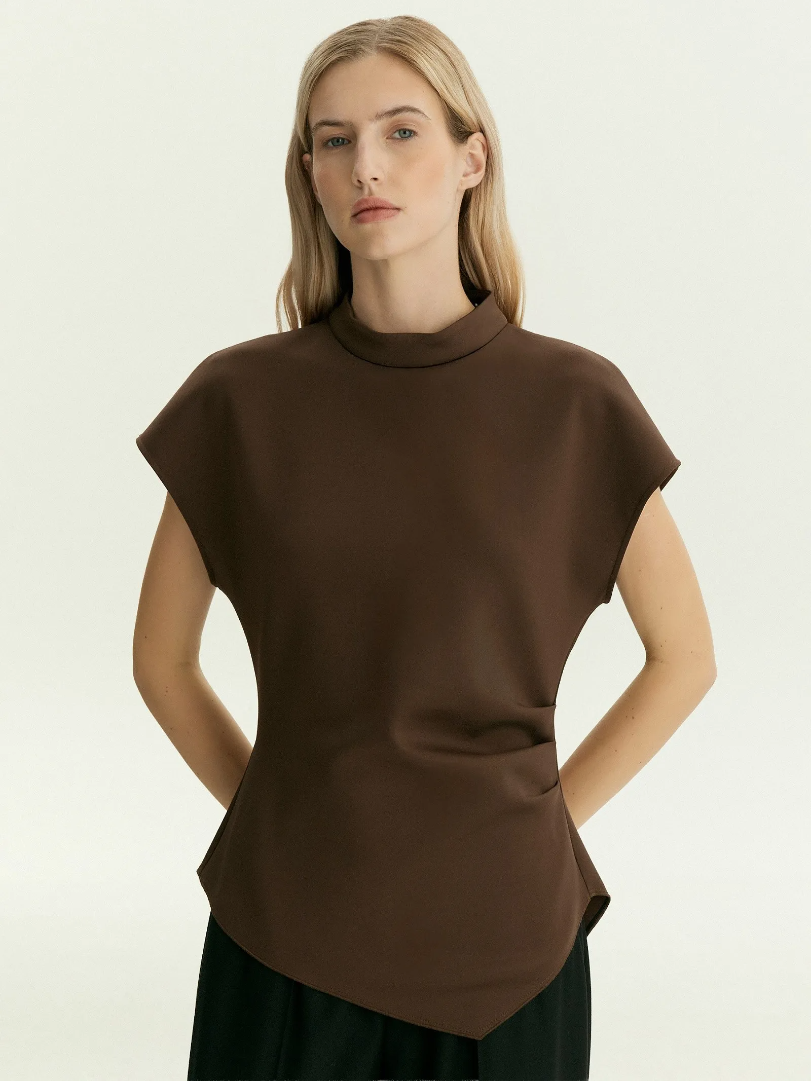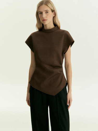 Такая трикотажная блуза сделает повседневные выходы впечатляющими. Трендовый крой придаёт образам смелость, которую уравновешивают закрытый фасон и сдержанный цвет мокко. Также крой подчеркнёт достоинства и визуально скорректирует особенности — блуза украсит любую фигуру. Цельнокроеная модель выполнена с драпировками, асимметричным краем, спущенным плечом и очень аккуратной, изящно облегающей стойкой. Плотный трикотаж наполовину состоит из хлопка и комфортен к телу. Блуза может стать частью капсулы с платьем crayon.