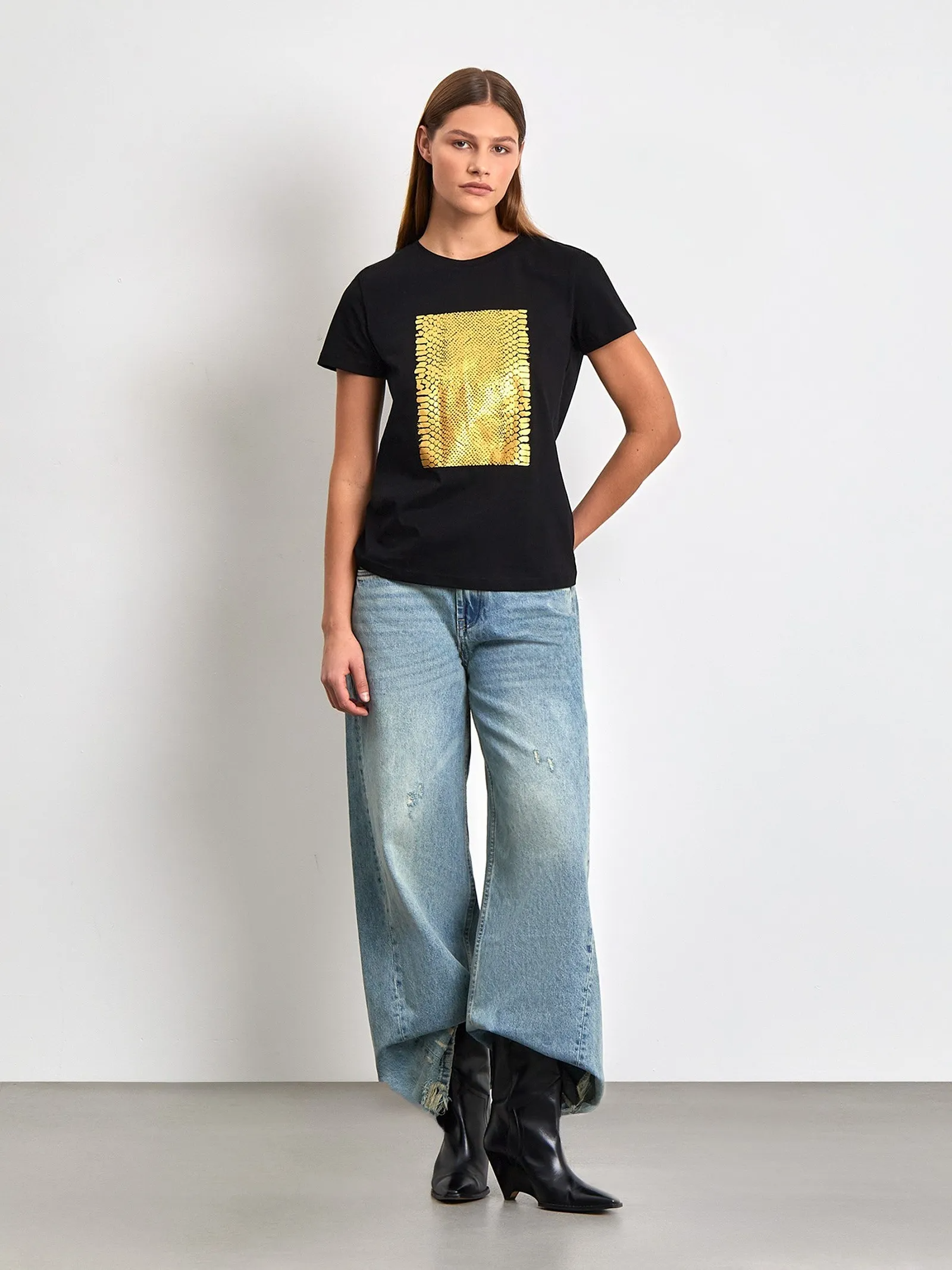 Хлопковая футболка с крупным золотым принтом добавит в гардероб немного сияния. За счёт чёрного фона футболка будет сочетаться с любым низом. Такая вещь может быть основой как повседневного, так и праздничного образа — например, к Новому году.