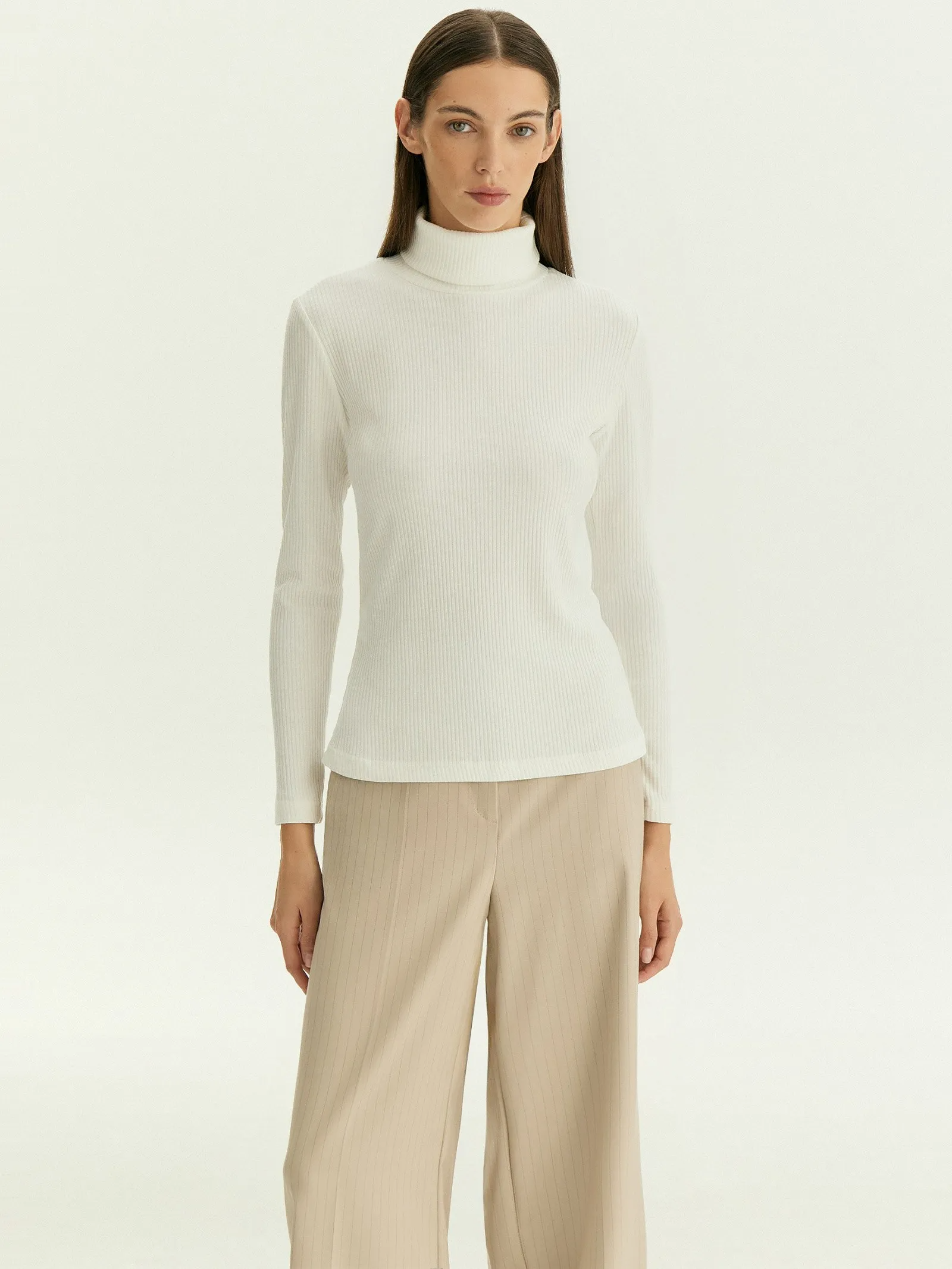 Базовая водолазка приталенного силуэта нежного белого цвета. Модель имеет высокий воротник. Изделие выполнено из материала с высоким содержанием вискозы, эластан в составе придаёт эластичности. Водолазку можно надеть solo с экокожей на прогулку, в офис с классическими брюками под жакет.
