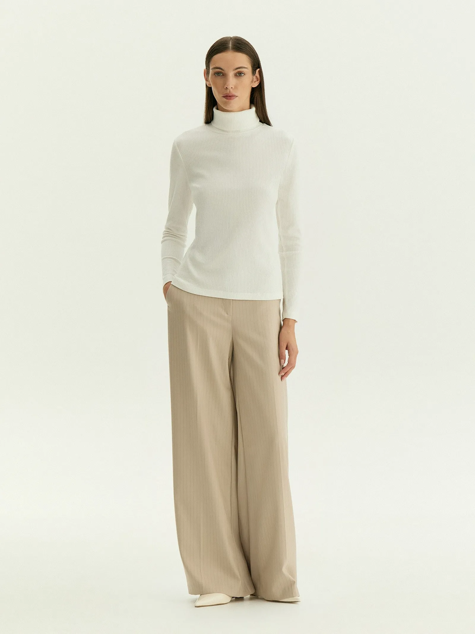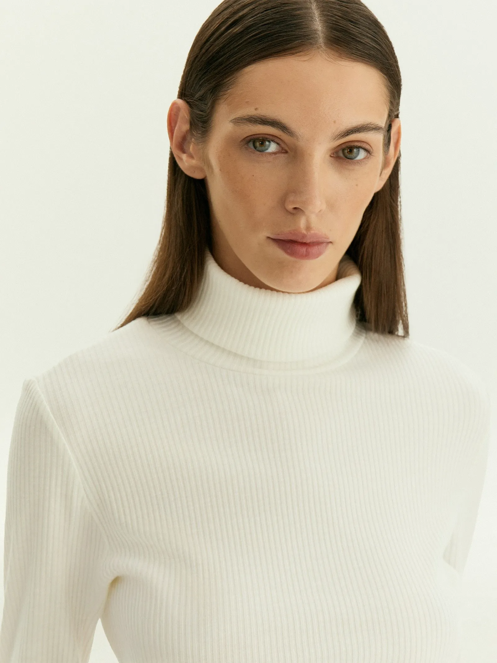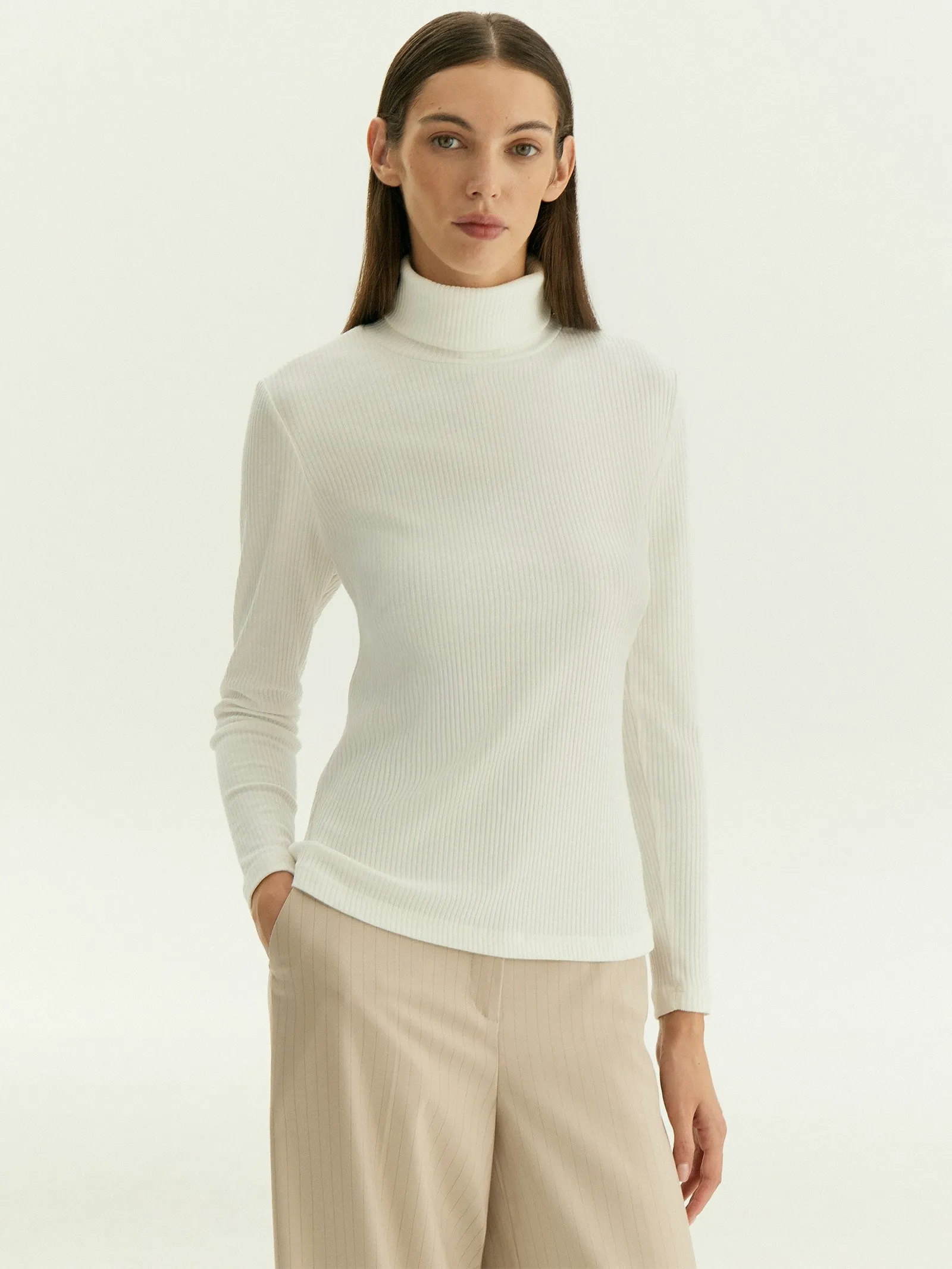 Базовая водолазка приталенного силуэта нежного белого цвета. Модель имеет высокий воротник. Изделие выполнено из материала с высоким содержанием вискозы, эластан в составе придаёт эластичности. Водолазку можно надеть solo с экокожей на прогулку, в офис с классическими брюками под жакет.