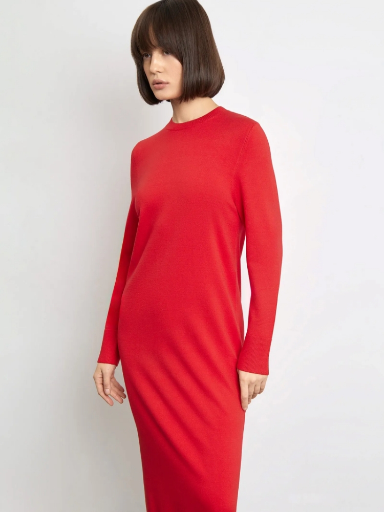 Трикотажное платье красного цвета отлично впишется в повседневный гардероб. В меру свободное, с длинными рукавами и круглым вырезом, оно не стесняет движений и комфортно ощущается на теле. Платье выполнено из материала с высоким содержанием дышащей и мягкой вискозы: материал хорошо подходит на демисезон
