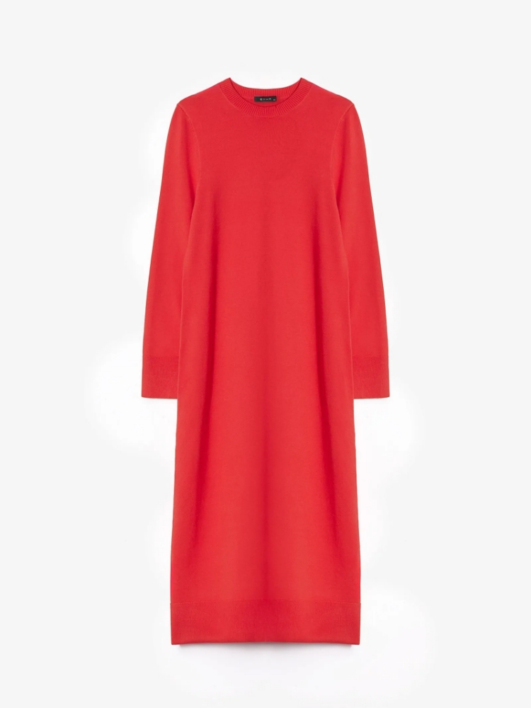 Трикотажное платье красного цвета отлично впишется в повседневный гардероб. В меру свободное, с длинными рукавами и круглым вырезом, оно не стесняет движений и комфортно ощущается на теле. Платье выполнено из материала с высоким содержанием дышащей и мягкой вискозы: материал хорошо подходит на демисезон