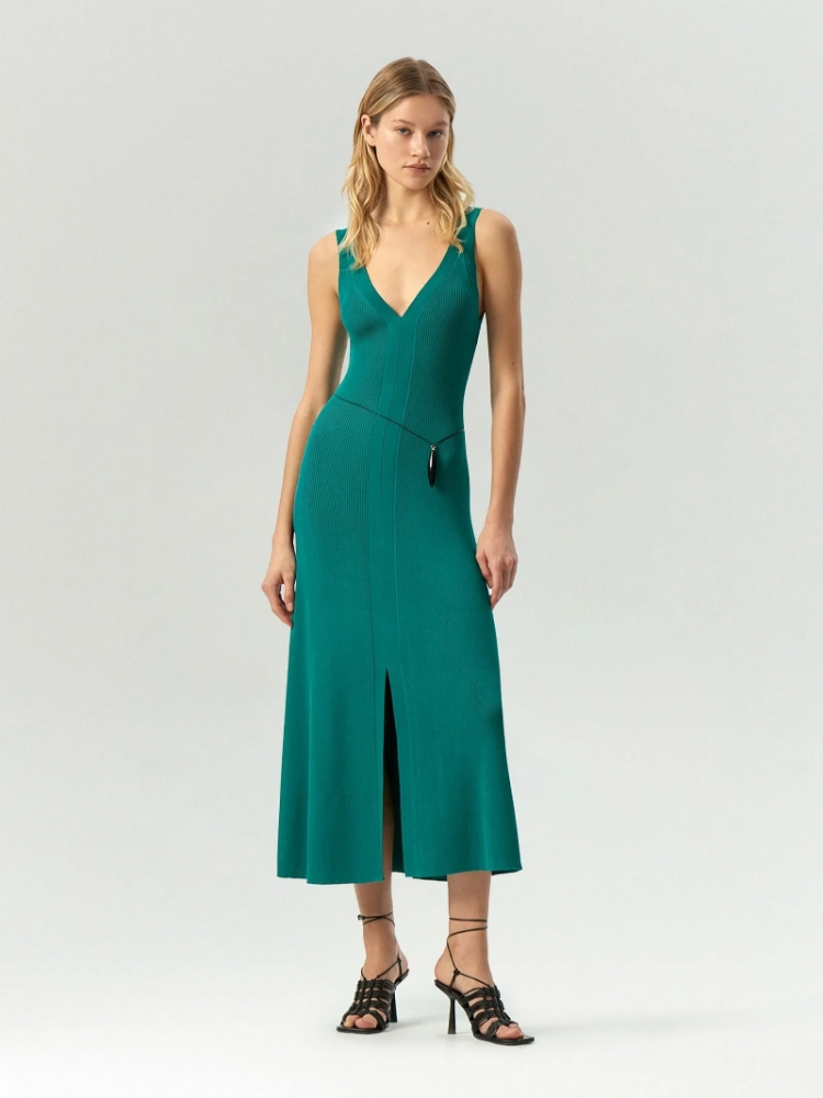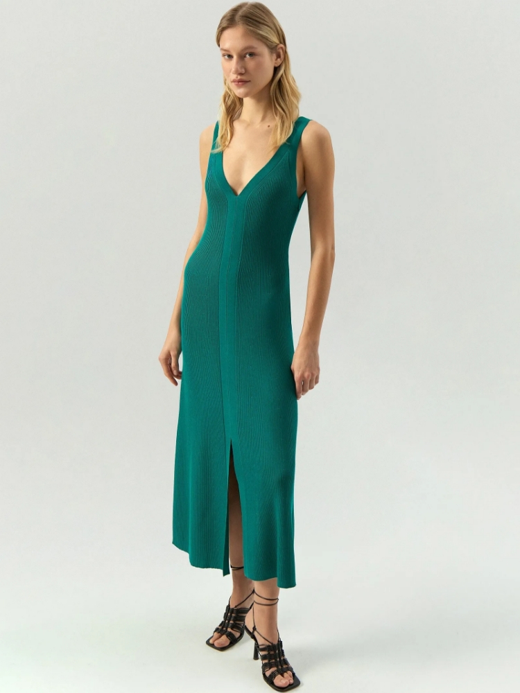 Трикотажное платье в ярком бирюзово-зелёном цвете для запоминающихся образов на каждый день. Визуально вытягивает силуэт и комфортно садится по фигуре. Спереди и сзади расположены V-образные вырезы, которые идут любому типу фигуры. Модель длины миди имеет разрез спереди для свободы шага. Платье хорошо сочетается с открытой летней обувью, плетёными и кожаными сумками. Выполнено из материала с высоким содержанием вискозы