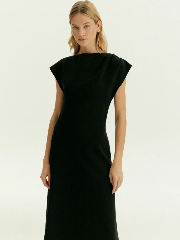 Элегантное платье в чёрном цвете подойдёт на выход или на каждый день. За счёт материала оно будет актуально в любой сезон. Плотный трикотаж наполовину состоит из хлопка и комфортен к телу. Модель с коротким рукавом отличают асимметричный крой и драпировка в портретной зоне. Сзади имеется небольшой вырез-капля под крючками. Сделано без подкладки