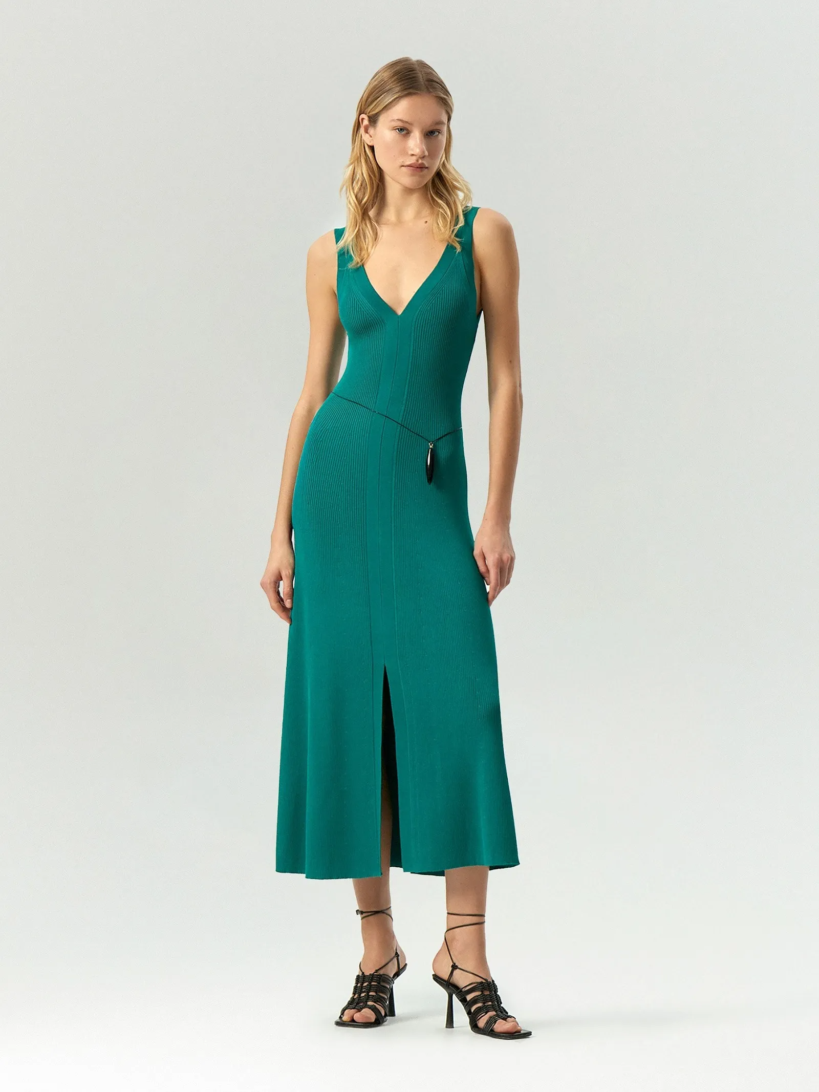 Трикотажное платье в ярком бирюзово-зелёном цвете для запоминающихся образов на каждый день. Визуально вытягивает силуэт и комфортно садится по фигуре. Спереди и сзади расположены V-образные вырезы, которые идут любому типу фигуры. Модель длины миди имеет разрез спереди для свободы шага. Платье хорошо сочетается с открытой летней обувью, плетёными и кожаными сумками. Выполнено из материала с высоким содержанием вискозы.