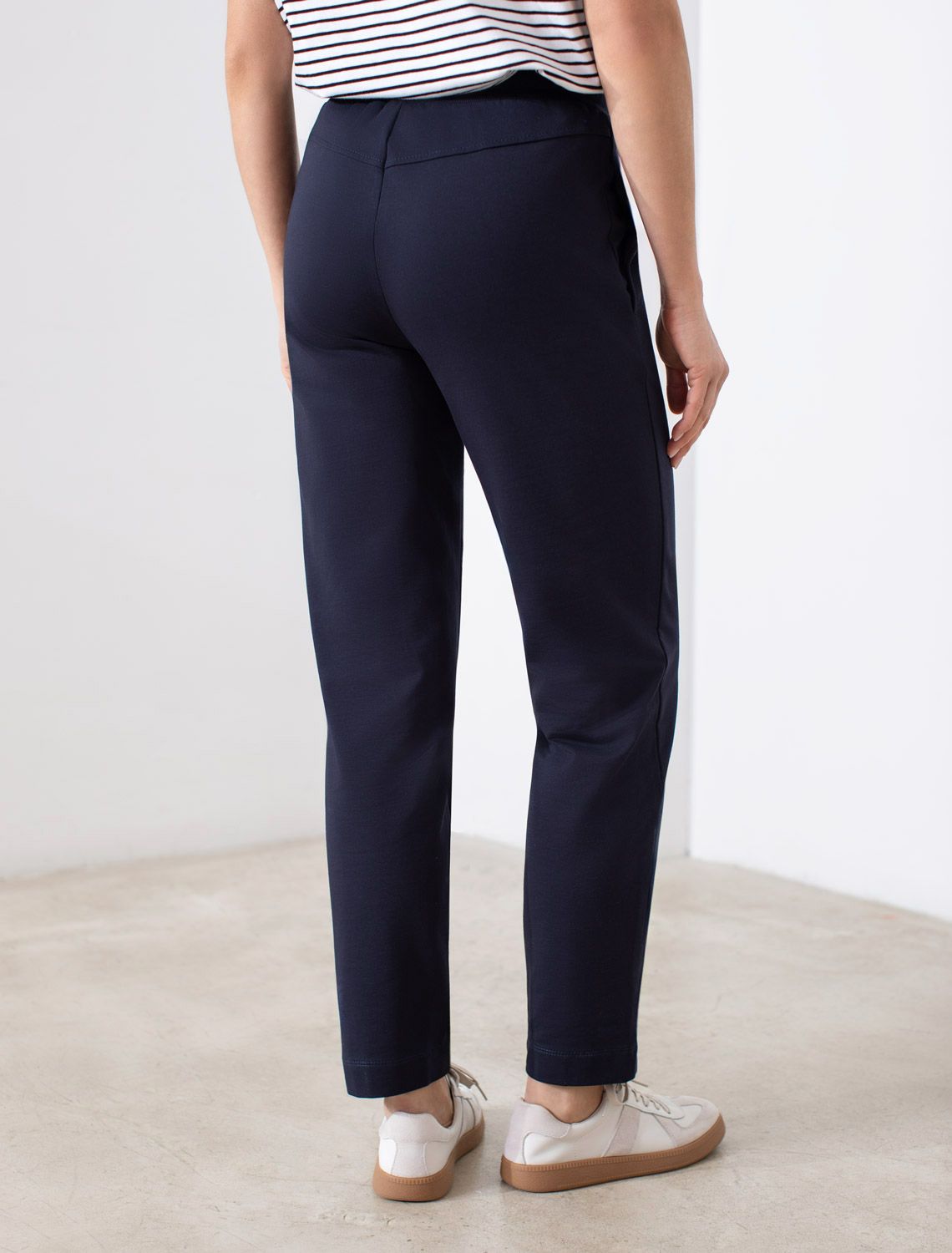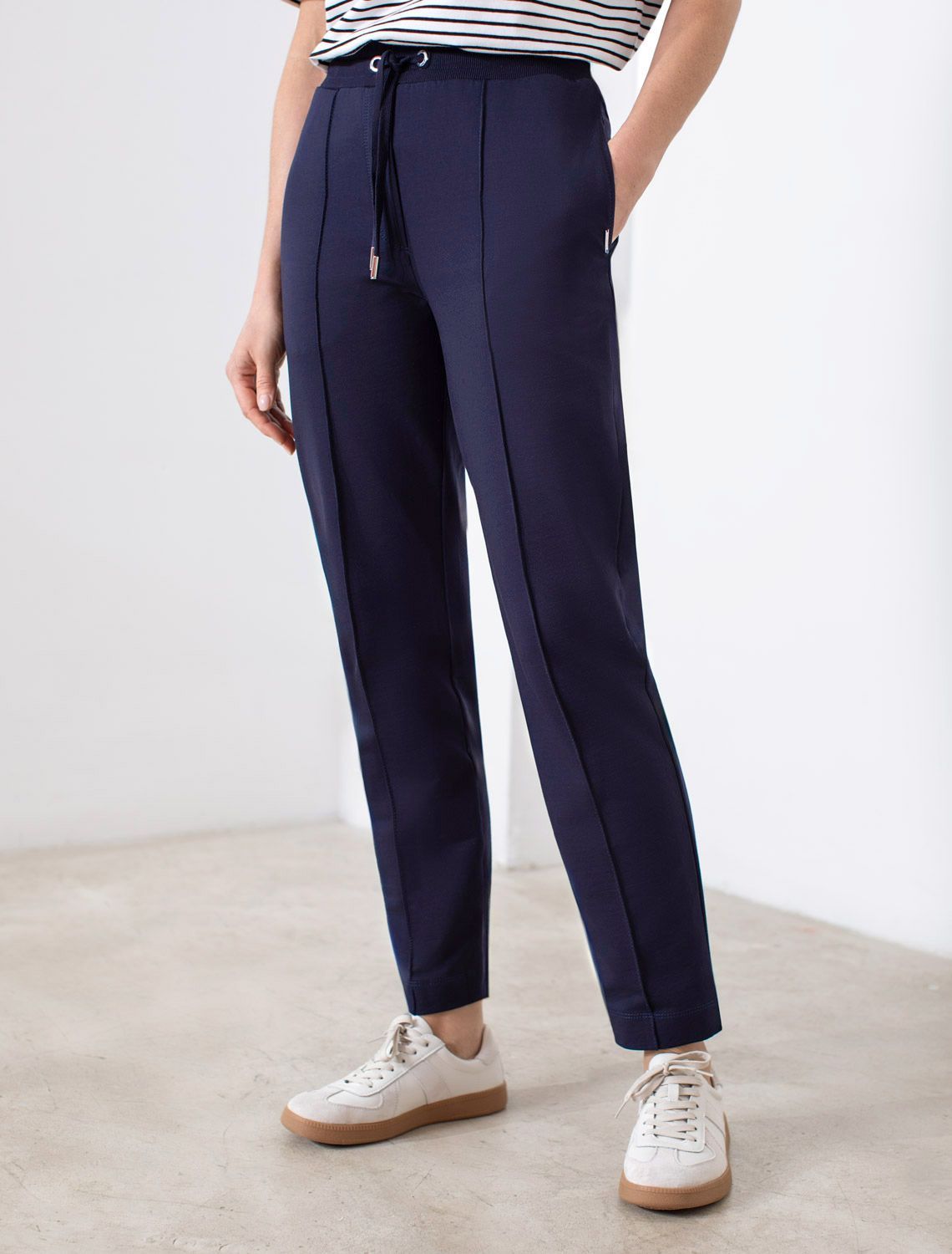 Брюки темно-синего цвета зауженного кроя выполнены из премиального футера-двухнитки. Лаконичный силуэт поддерживают застроченные стрелки, зрительно вытягивающие силуэт. Удобный пояс на резинке регулируется хлопковым шнурком с золотистой фурнитурой. Наличие эластана в составе изделия гарантирует комфорт и долговечность изделия. Эластичный материал хорошо пропускает воздух, позволяя телу дышать, и легко тянется, не ограничивая движения.