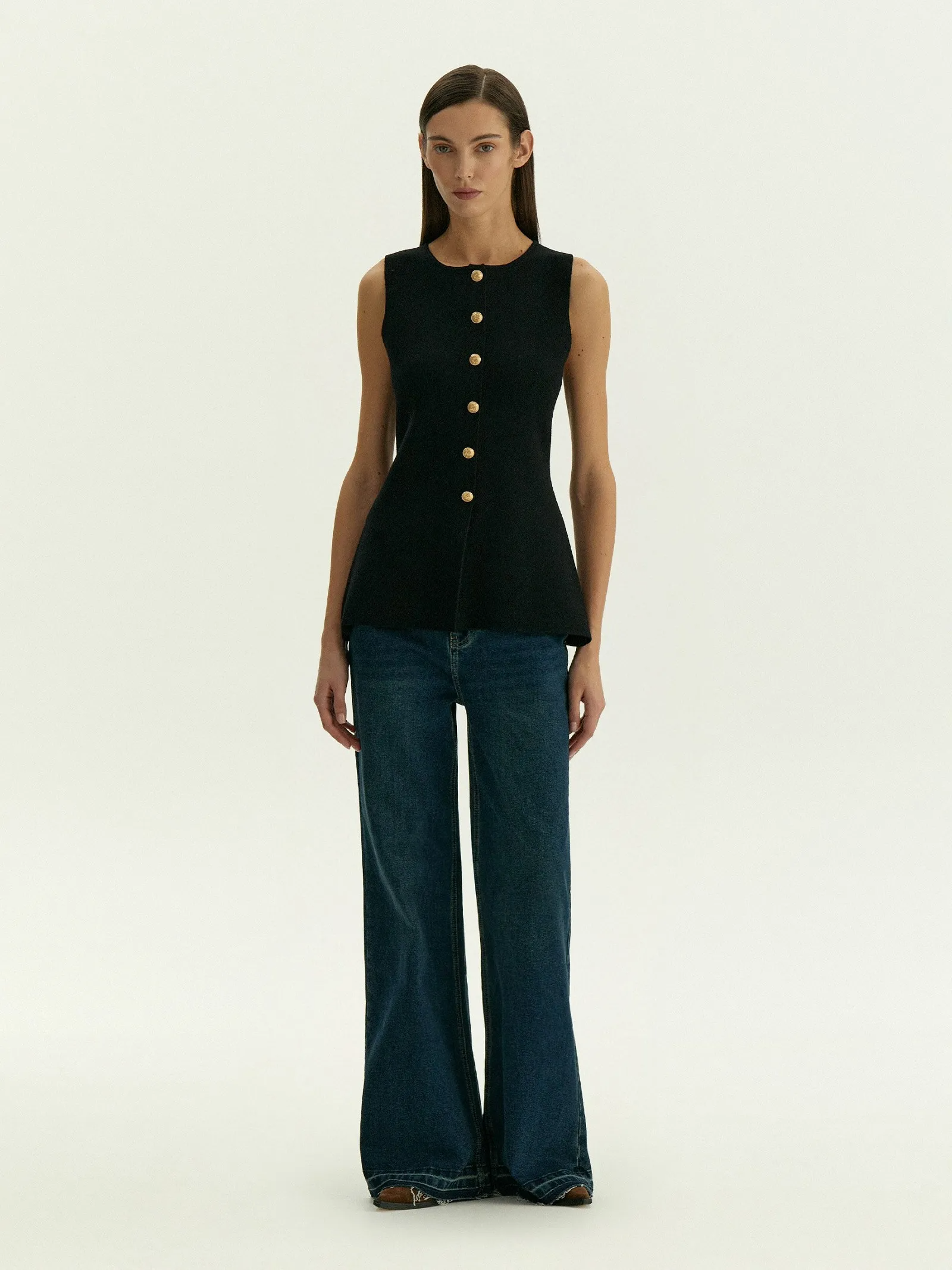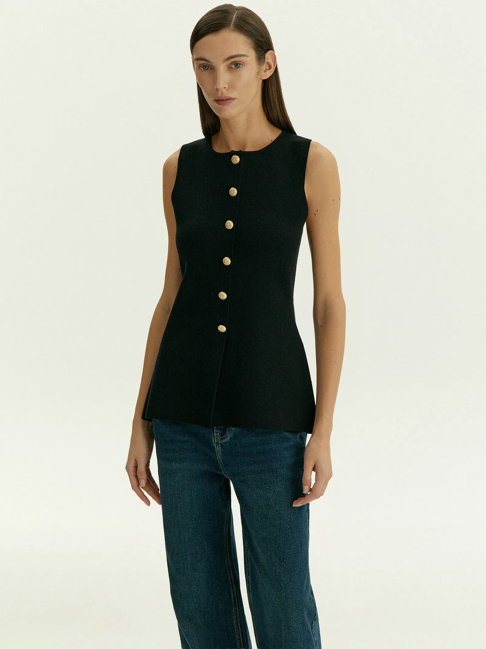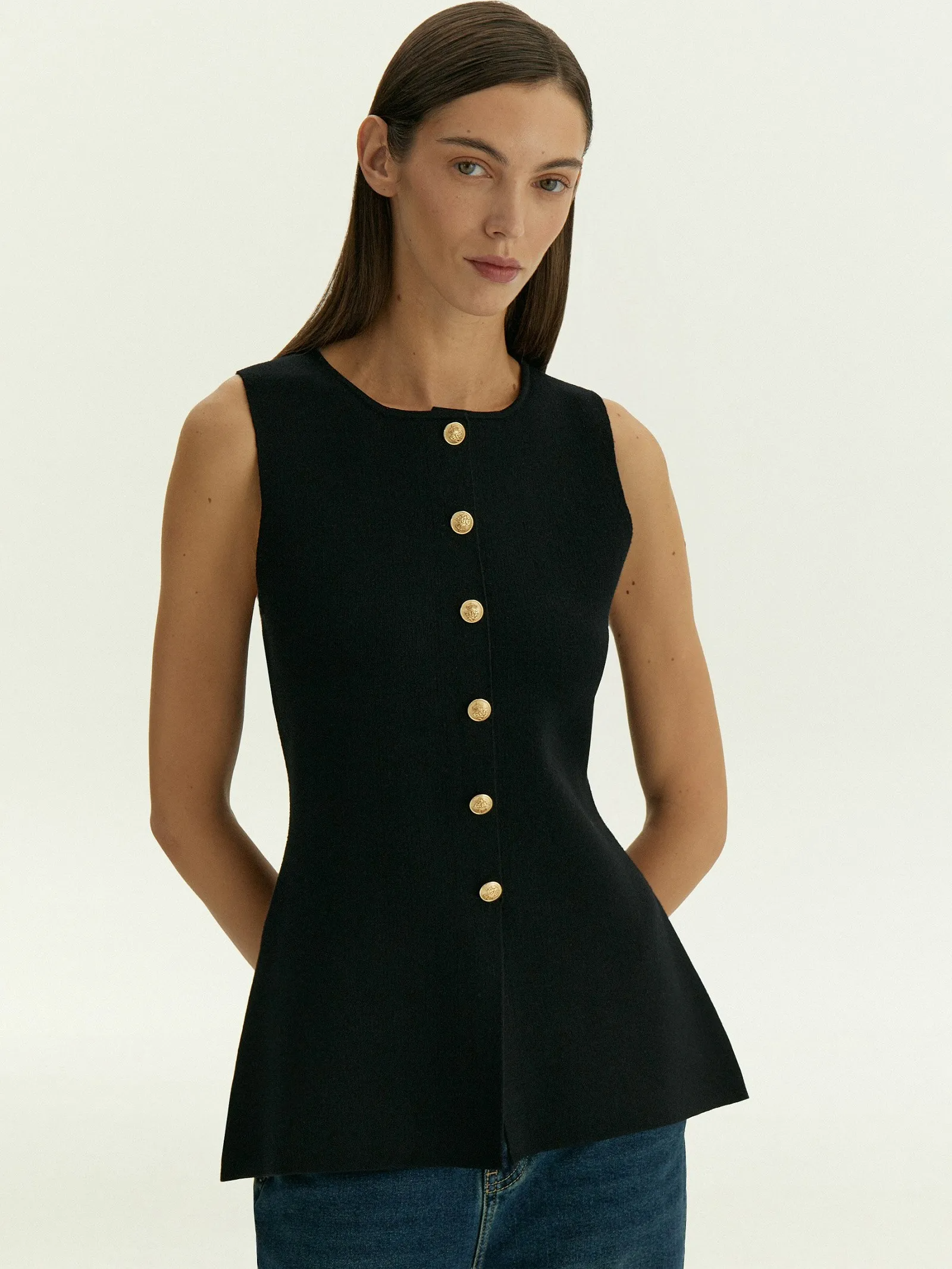 Топ с имитацией жакета дополнен рядом декоративных, не расстегивающихся пуговиц.