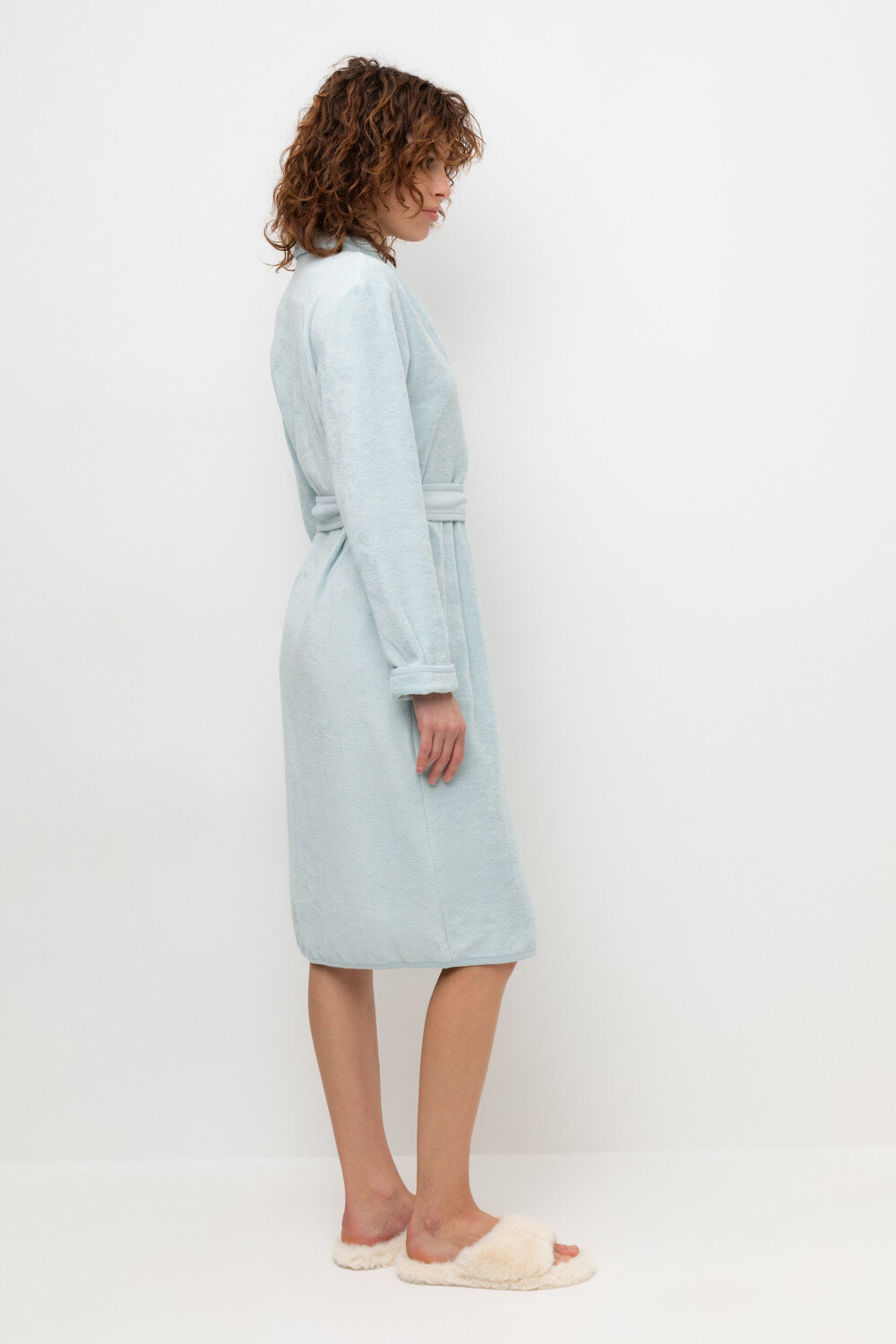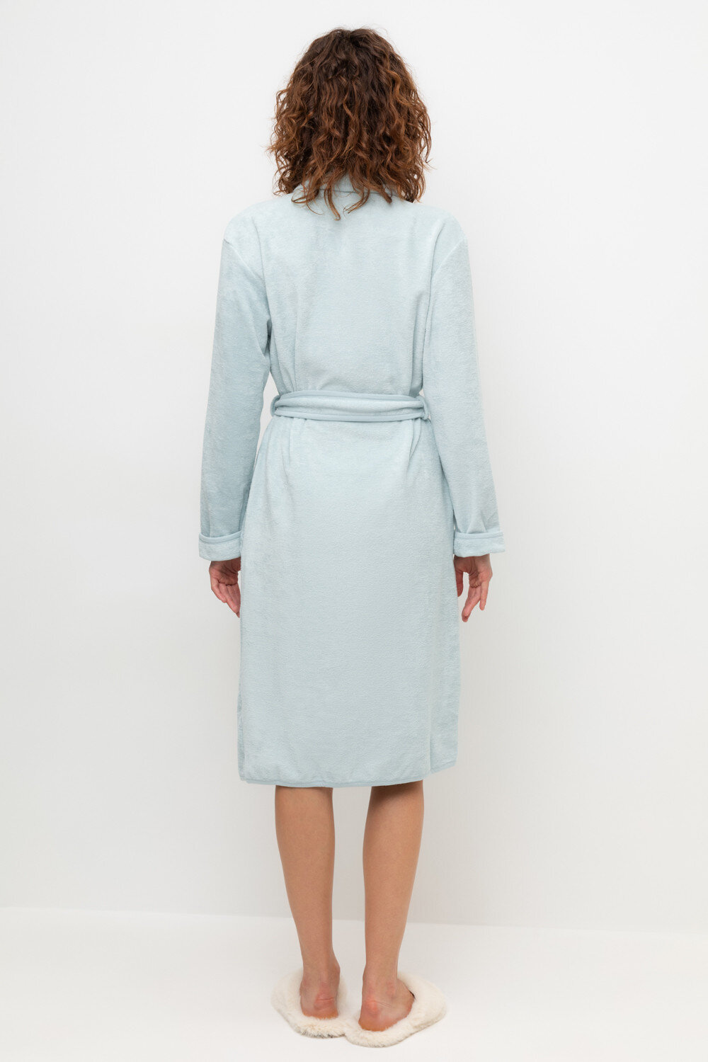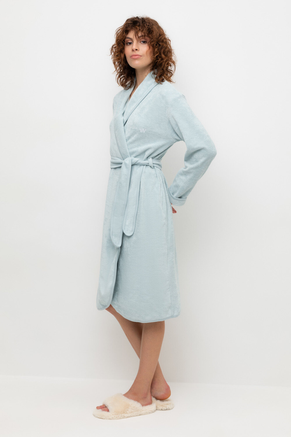 Уютный легкий махровый халат на запах с длинными рукавами. В боковых швах два удобных кармана. На груди вышивка. С помощью пояса можно регулировать посадку и силуэт. Материал приятен к телу и позволяет коже дышать.
