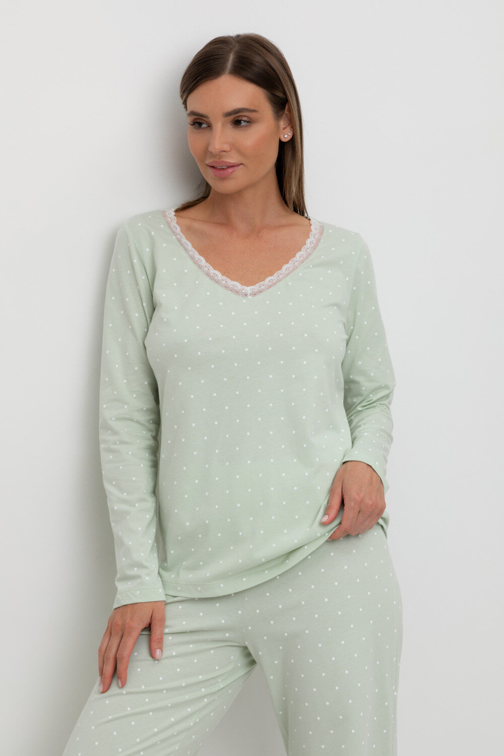 Легкий комплект для комфортного сна и отдыха набивного трикотажа с нежным рисунком из 100% натурального хлопка. Джемпер с V-образным вырезом, украшенный эластичным кружевом комфортно садится по фигуре. Брюки с поясом на резинке и атласной лентой. Гладкий материал приятен к телу и позволяет коже дышать.