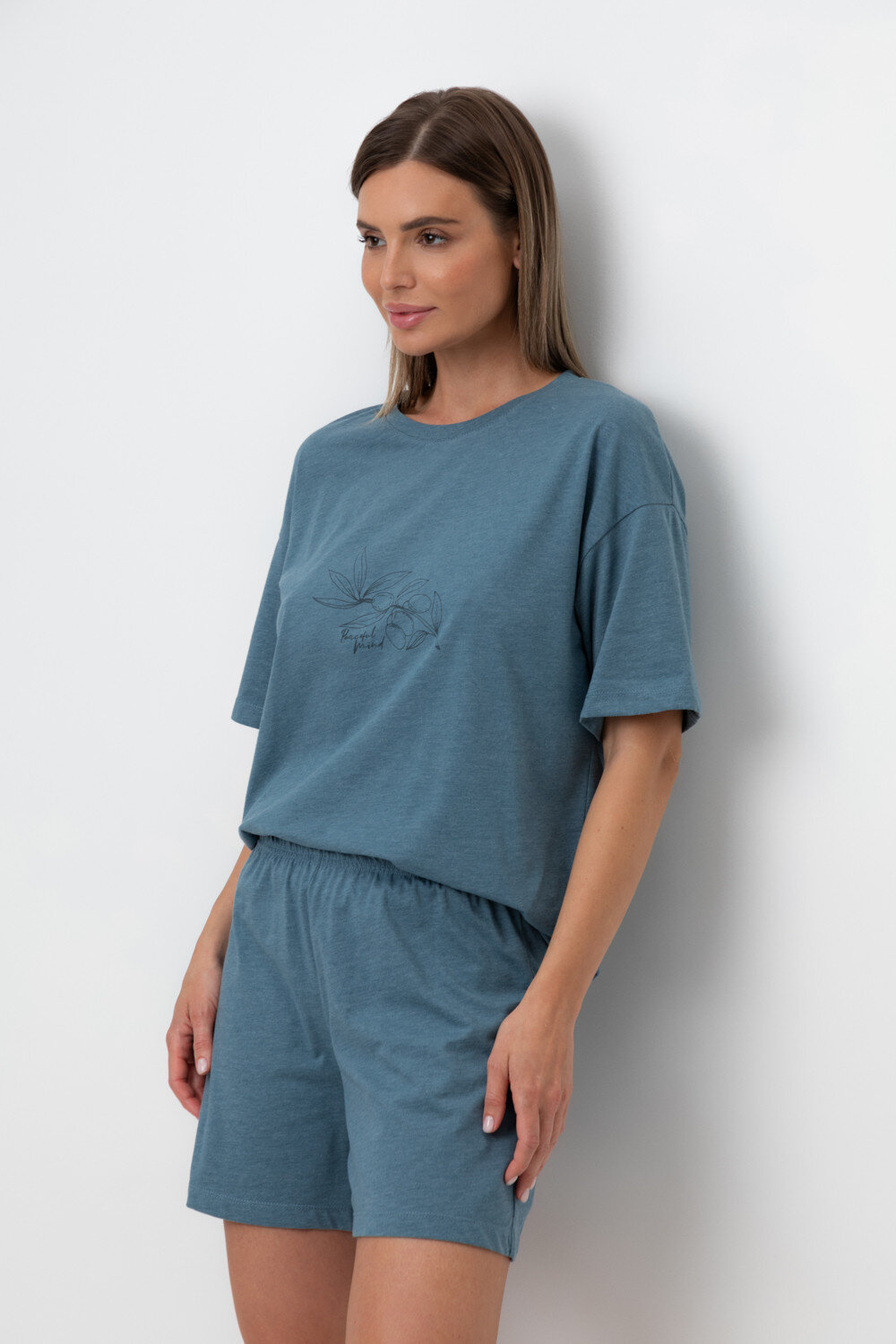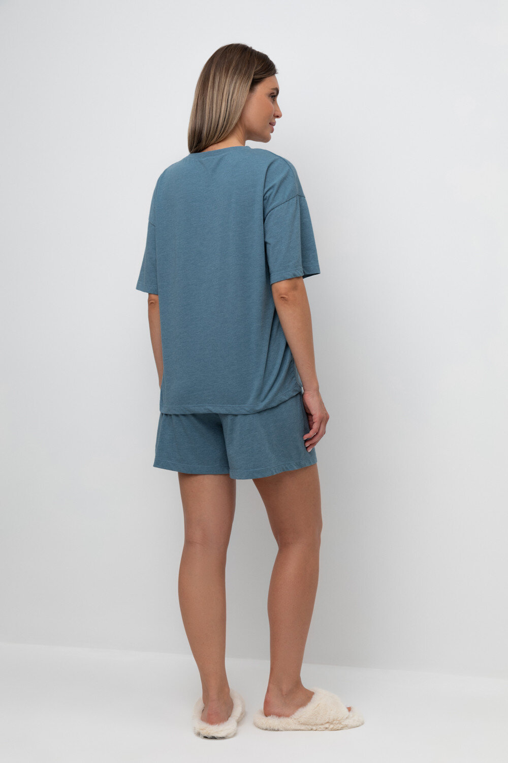 Комплект для комфортного сна и отдыха. Футболка с короткими рукавами, спущенной линией плеча и принтом комфортно садится по фигуре. Шорты с мягким поясом на резинке. В поясе шорт атласная лента. Свободный силуэт не сковывает движения.