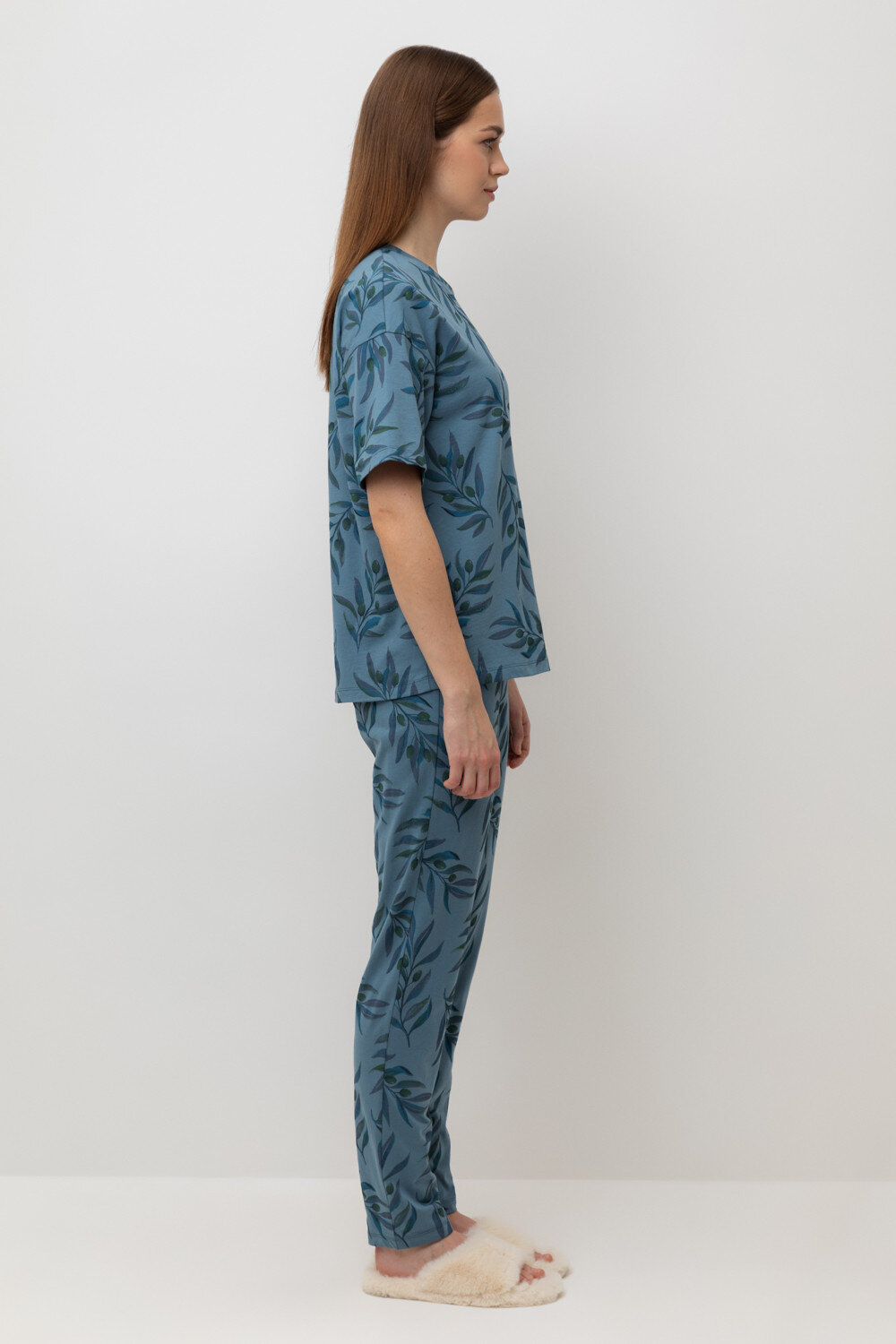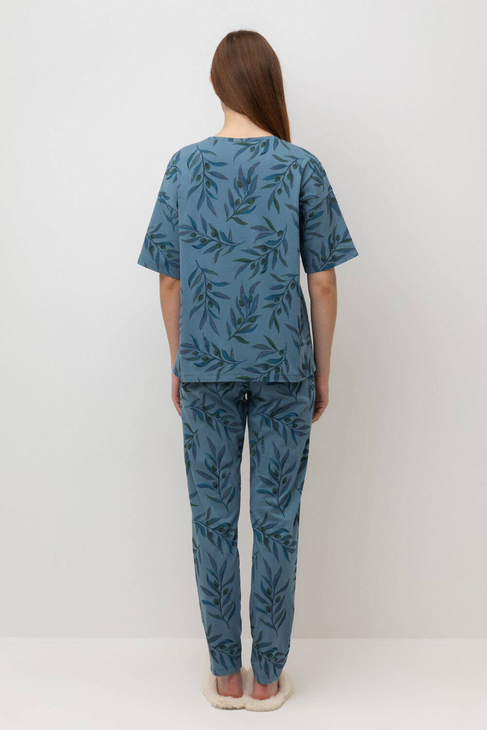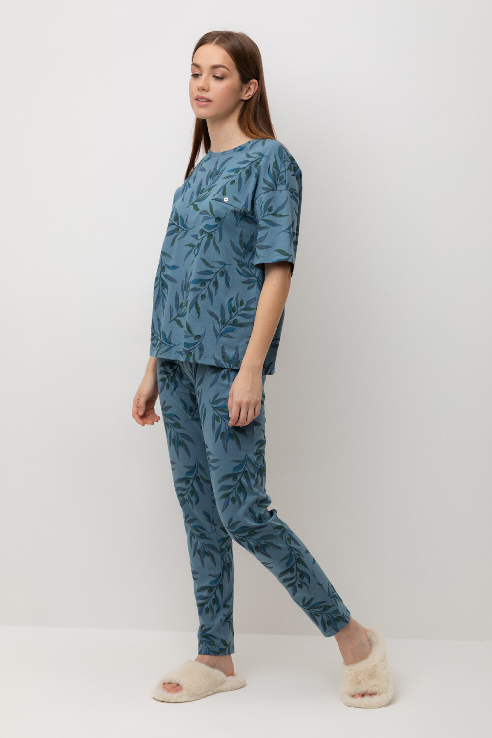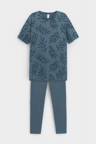 Легкий комплект для комфортного сна и отдыха из натурального хлопка. Футболка с карманом и спущенной линией плеча комфортно садится по фигуре. Брюки с поясом на резинке выполнены из набивного трикотажа. Гладкий материал приятен к телу и позволяет коже дышать.