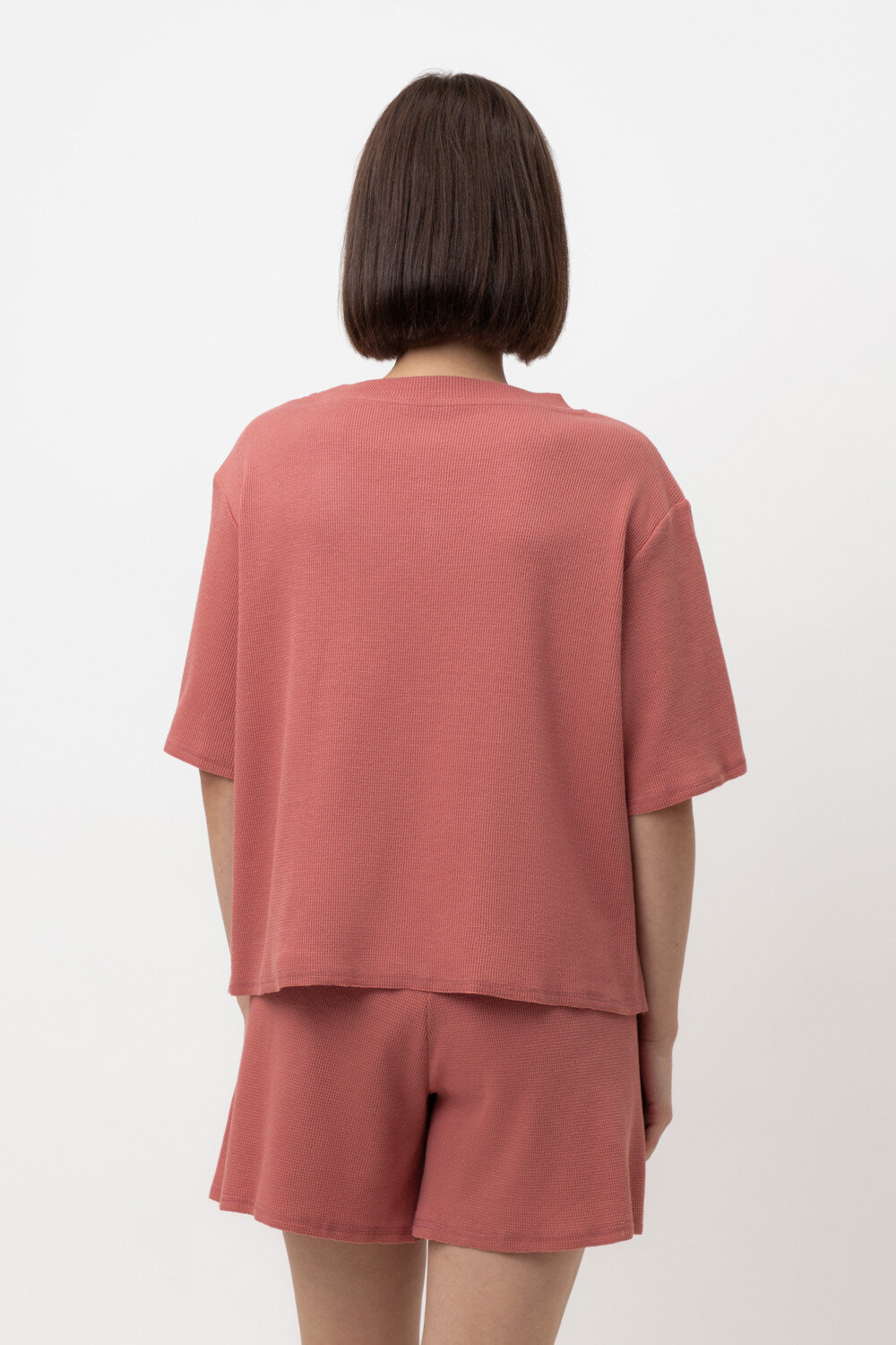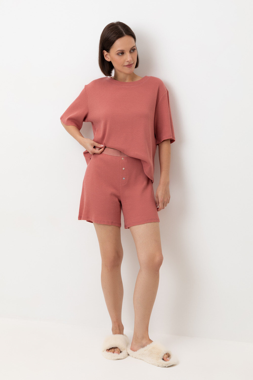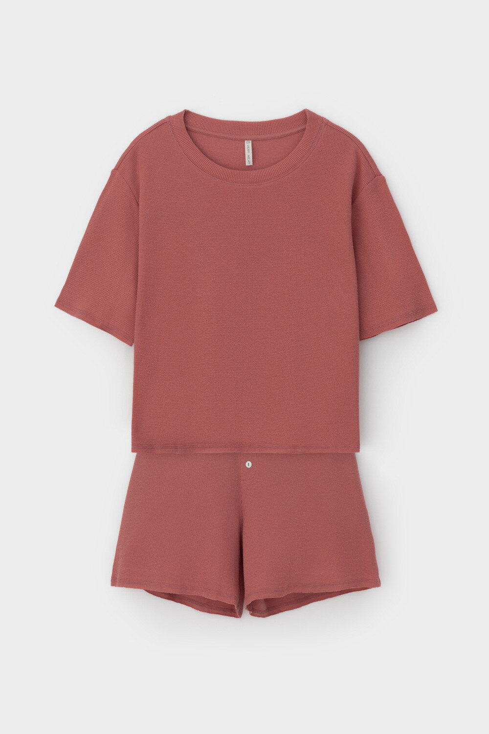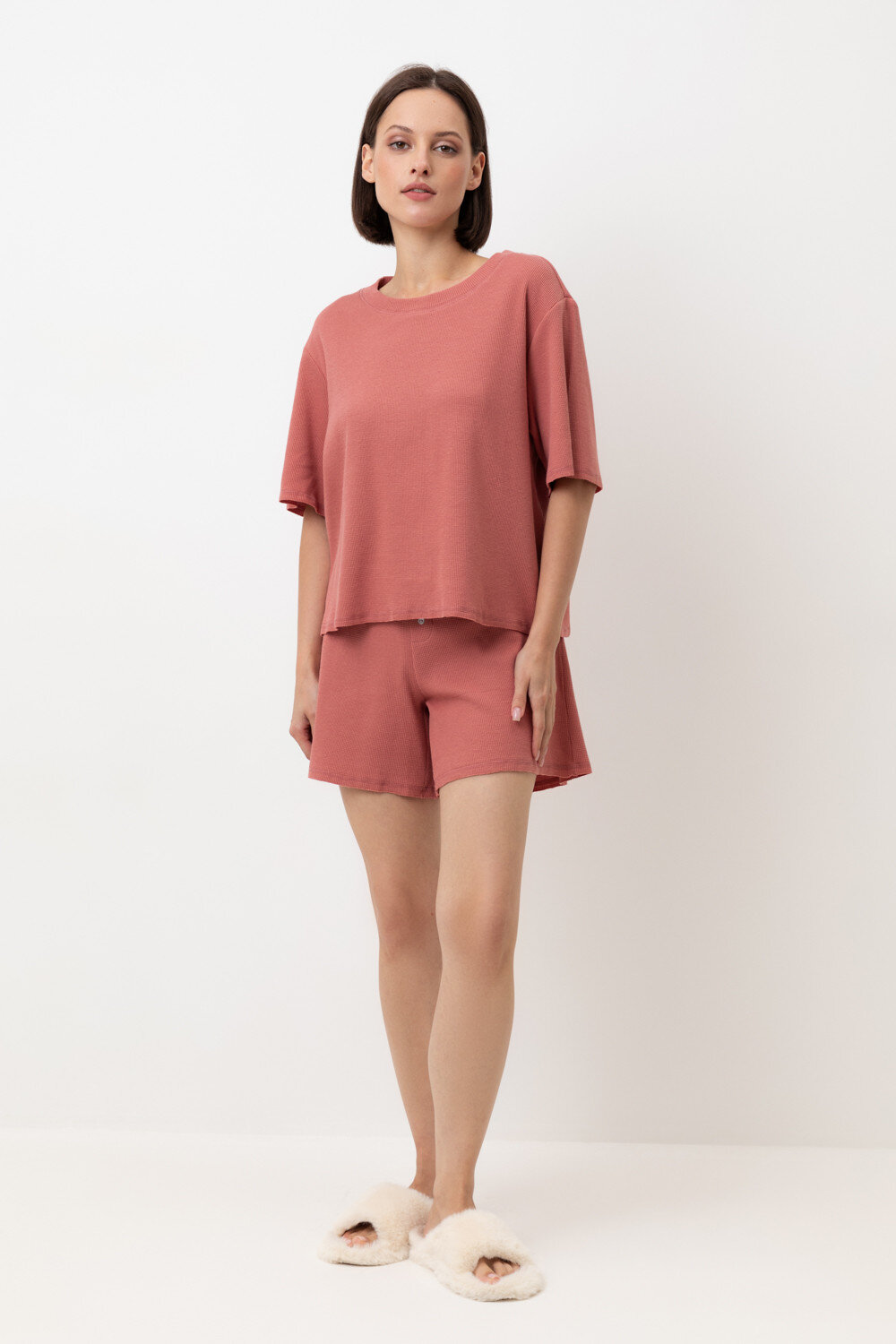 Комплект из объемного трикотажа с добавлением эластичных волокон. Свободный силуэт и мягкий пояс обеспечат комфорт во время сна и отдыха.